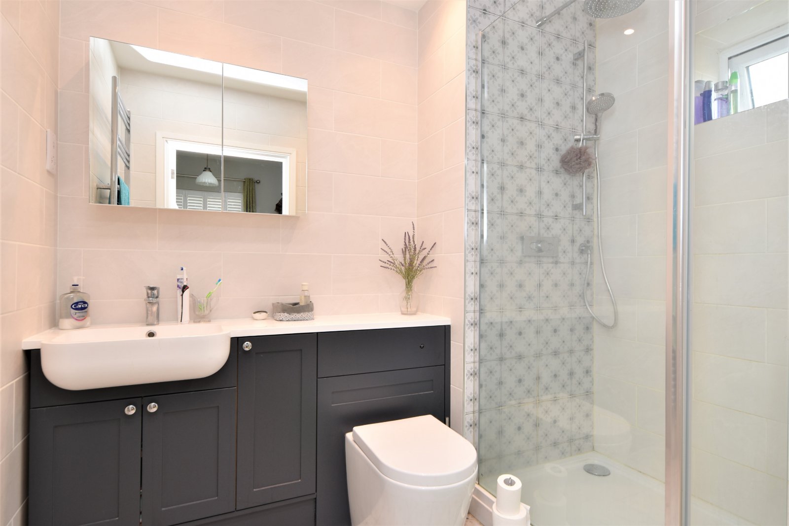 High level obscure double glazed window to side aspect. The modern suite comprises a double width shower enclosure with fitted shower screen, inset with integrated shower unit with separate hand held attachment and a 'drencher' style shower head over, Vanity unit inset with wash hand basin with mixer tap over and storage cupboards under with concealed 'sensor control' flush WC. Ladder style heated towel rail. Shaver point. Tiling to all visible walls. Attractive tiled flooring. Smooth plastered ceiling.