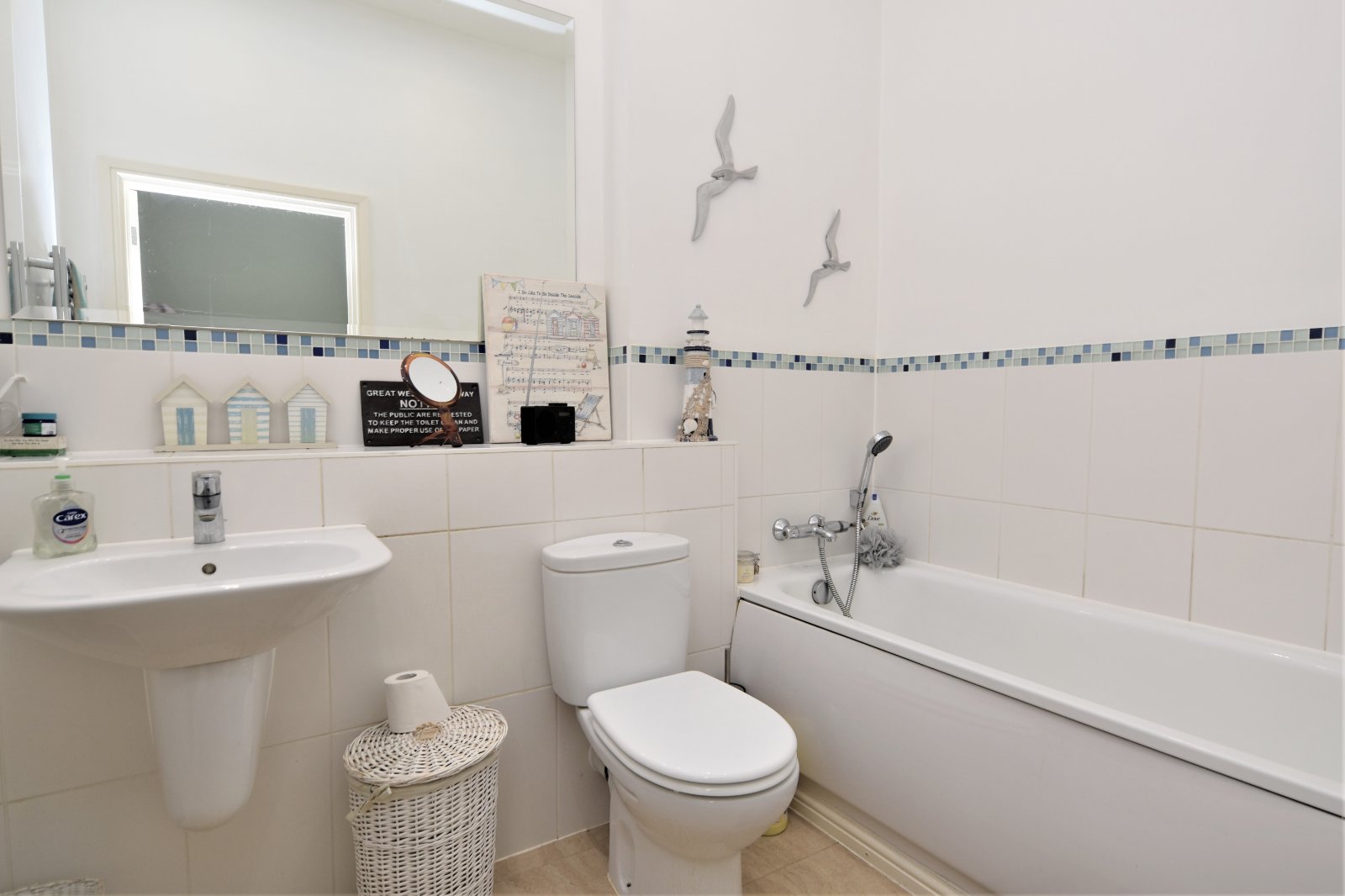 The modern white suite comprises a panelled enclosed bath with mixer tap over with shower attachment,