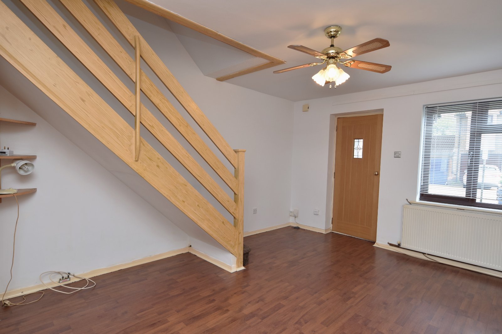uPVC double glazed window to front aspect. Stairs rising to first floor accommodation with open storage space under. Radiator. Feature electric fire. Smooth plastered ceiling. Door to;