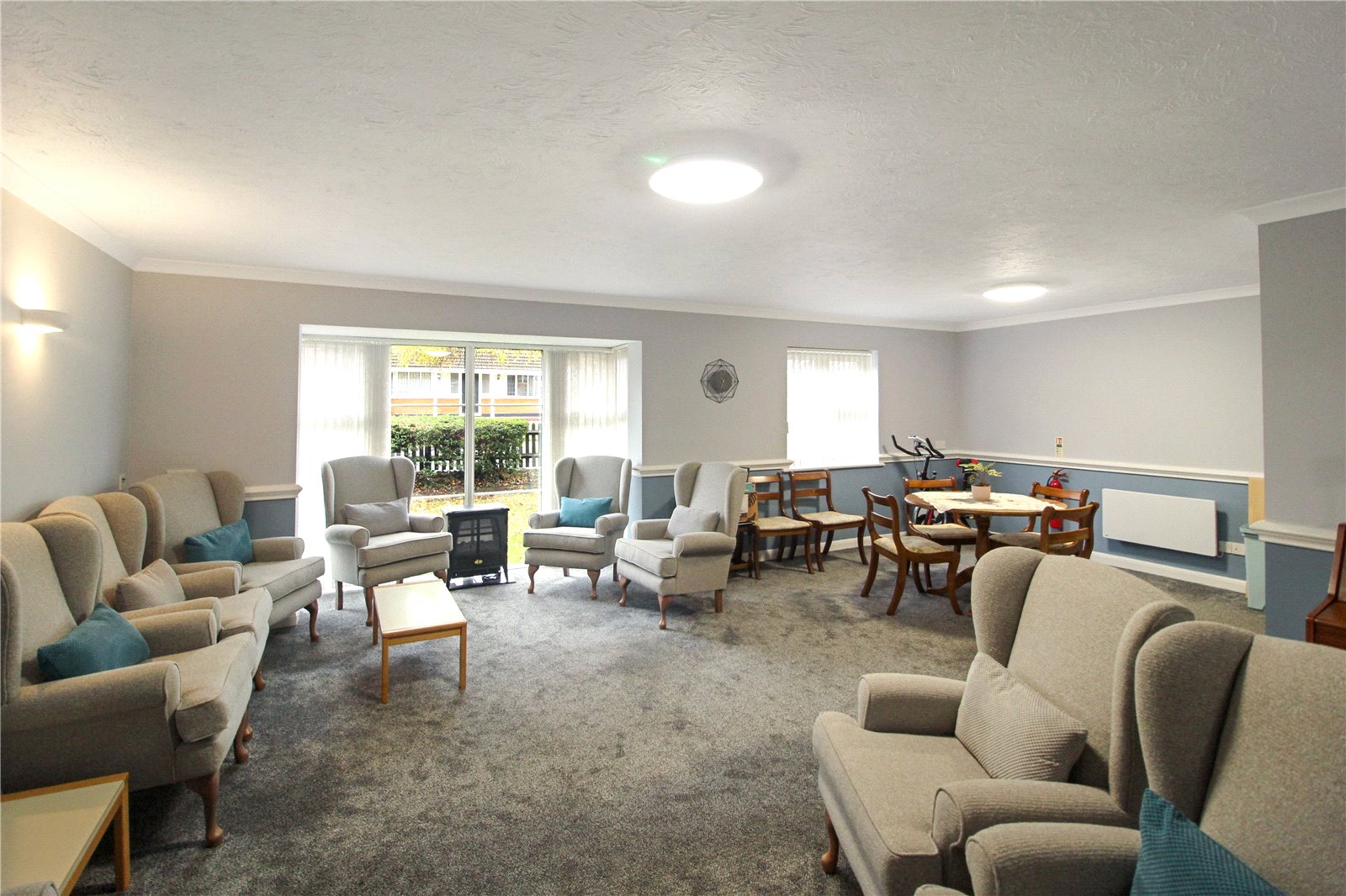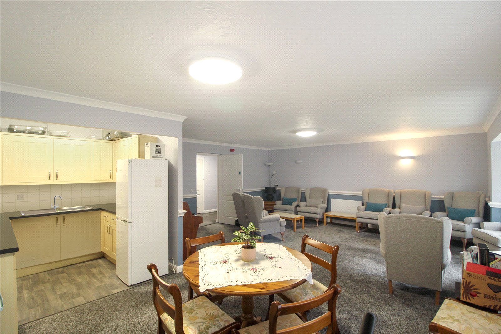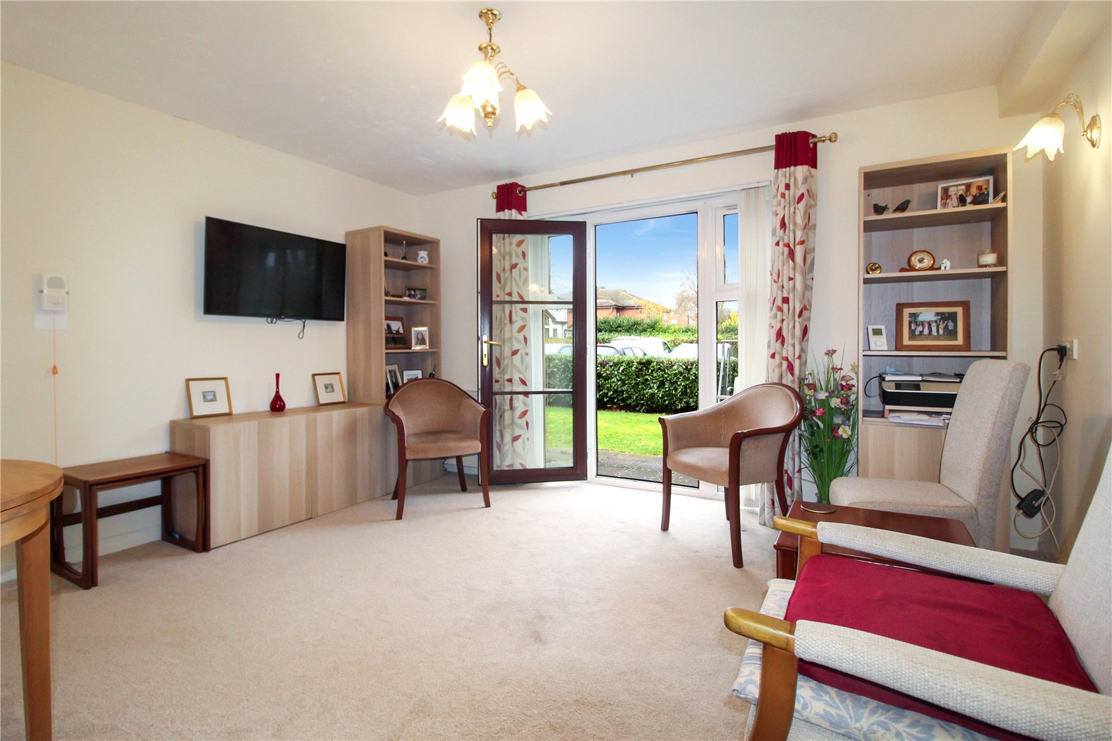 uPVC double glazed door to rear with uPVC double glazed windows adjacent onto West-facing patio, preceding communal gardens and residents' car park. Carpet to floor. Skirting. Electric heater. Careline pull chord. Smooth plastered walls. Two wall lights. Ceiling light. Archway into kitchen. NB: Television optional.