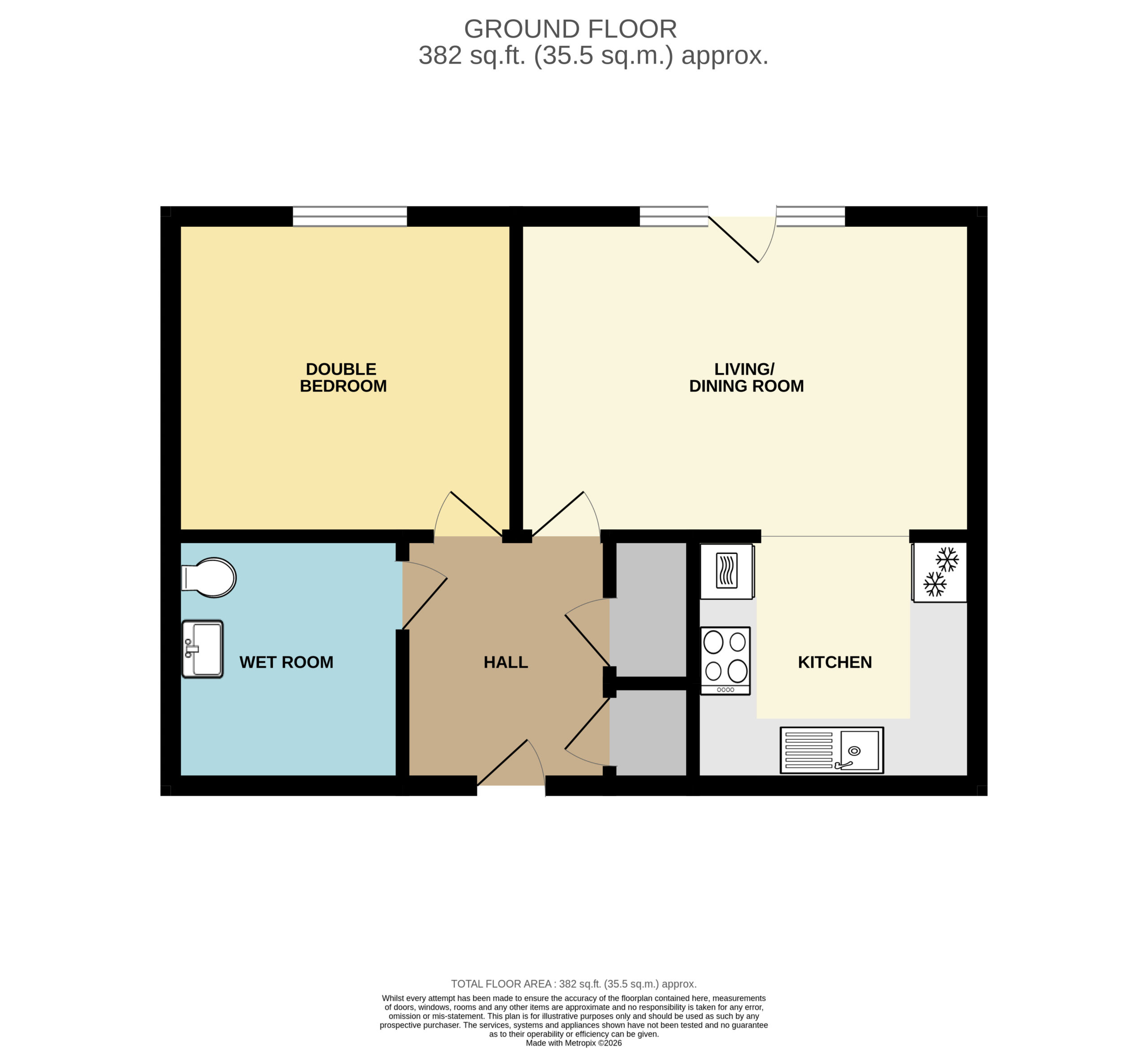 Entry through door from recently recarpeted Communal Hallway into spacious Entrance Hall. Carpet to floor. Skirting. Electric heater. Smooth plastered walls. Electric consumer unit. Ceiling light. Smoke alarm. Doors to Living / Dining Room, Double Bedroom, Wet Room and storage cupboards.