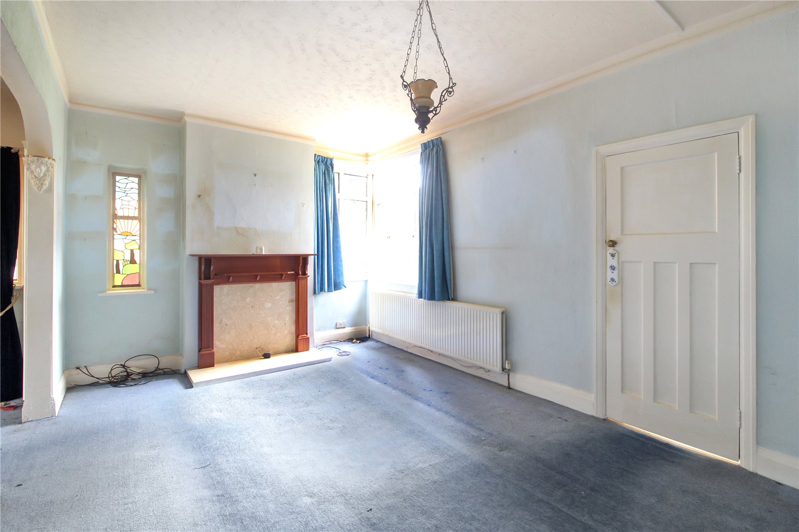 Generous size living room with carpeted flooring and smooth walls and ceiling light. Radiator, double glazed windows and two stained glass windows to front aspect.