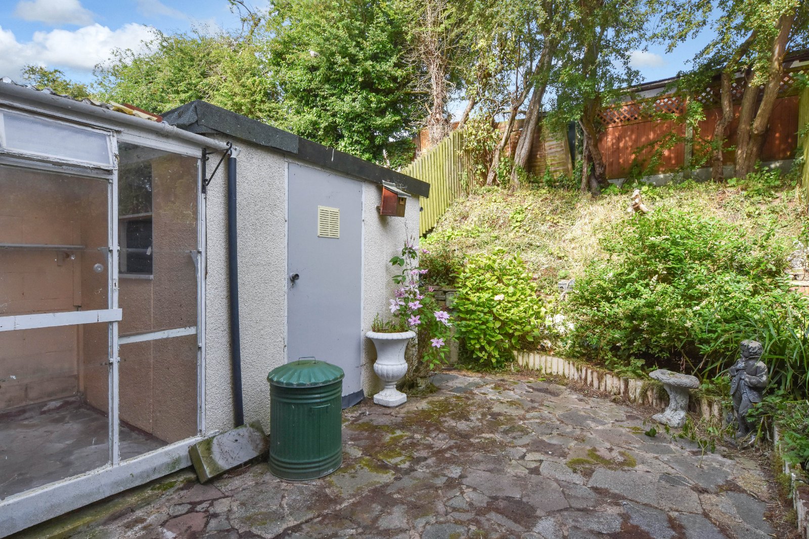 The rear garden is accessed via a covered lean to area with door to garden. Hardstanding area with access to storage unit (measuring 7'9 x 6'6).