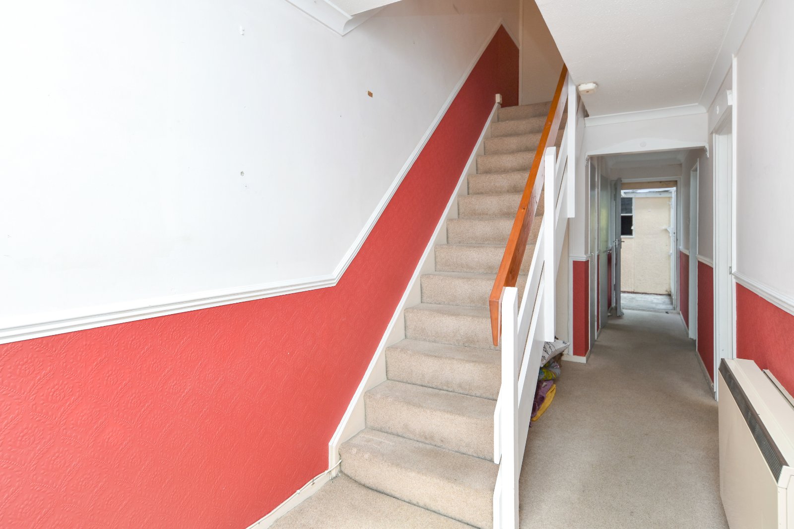 Stairs rising to first floor accommodation with under-stairs storage space. Access to Living Room, Kitchen and Ground Floor WC. Further door to good size storage cupboard. Part glazed door providing access to covered lean to. Storage heater. Coving to textured ceiling.
