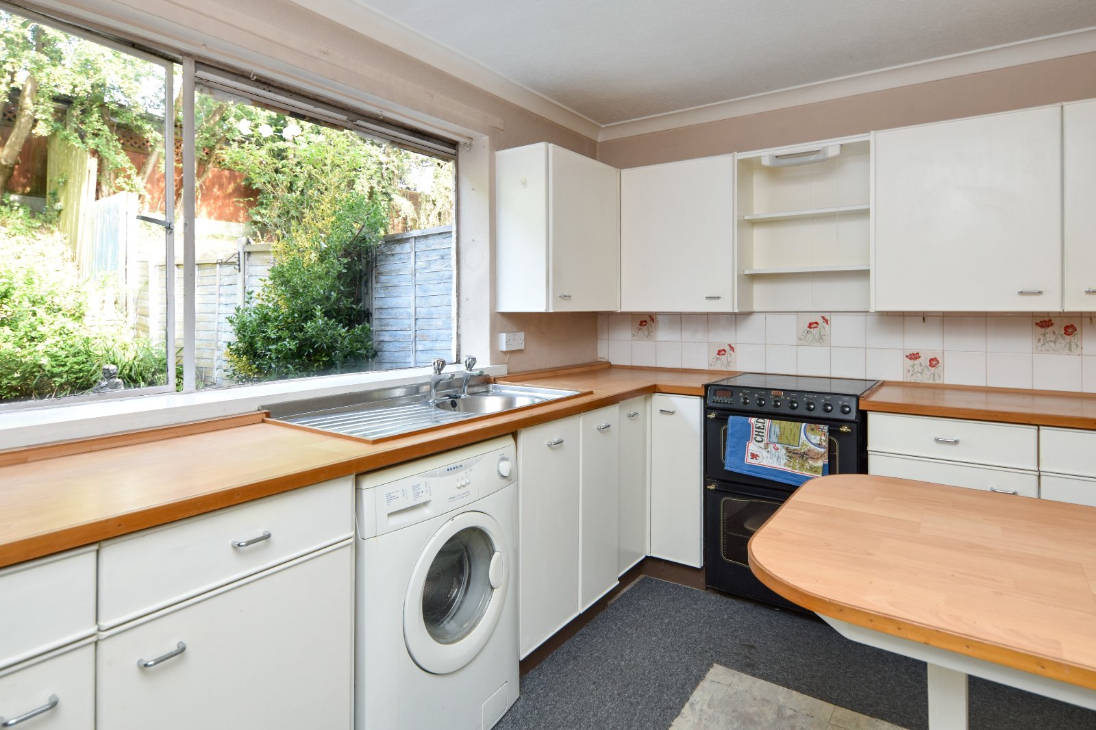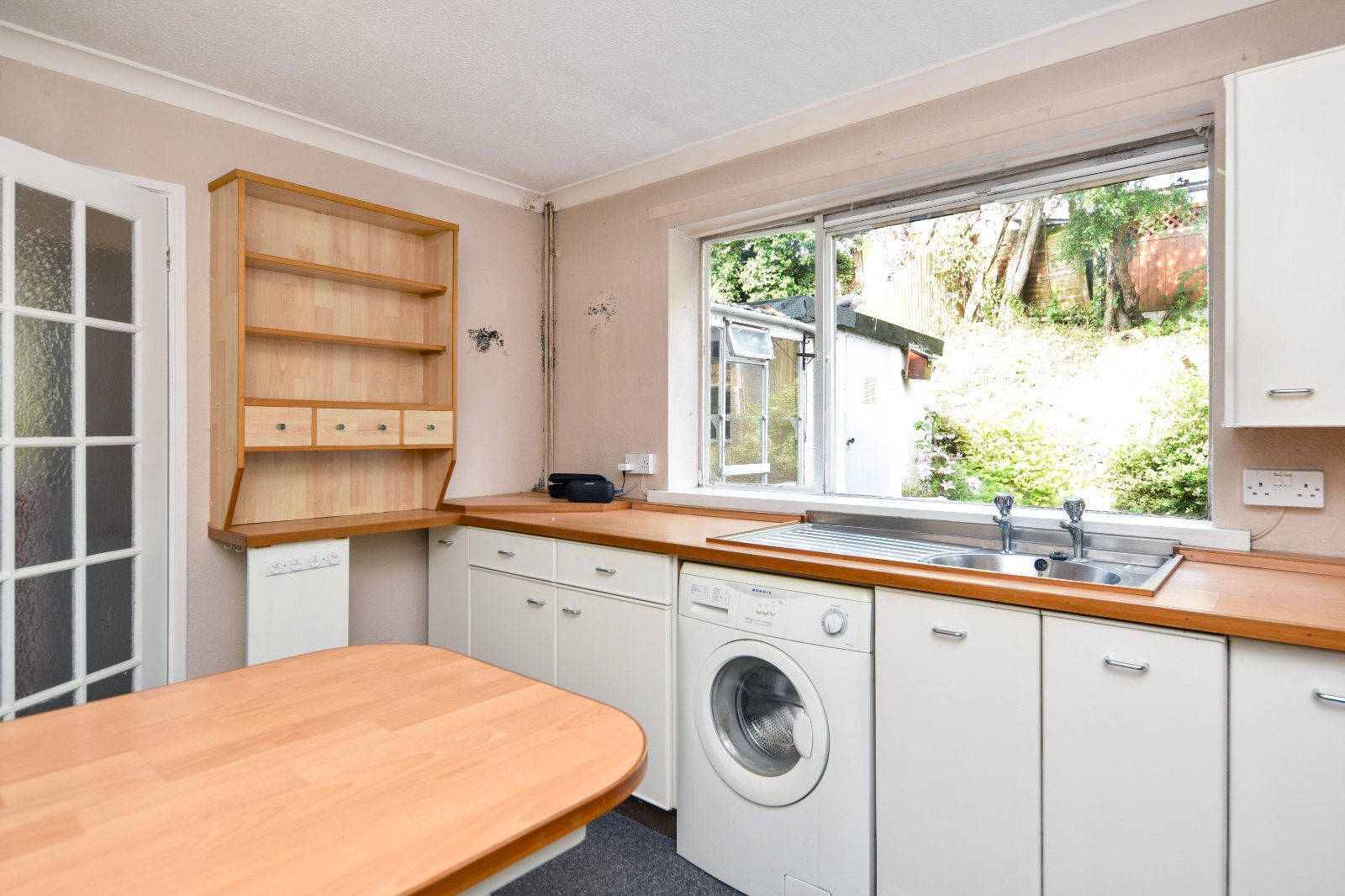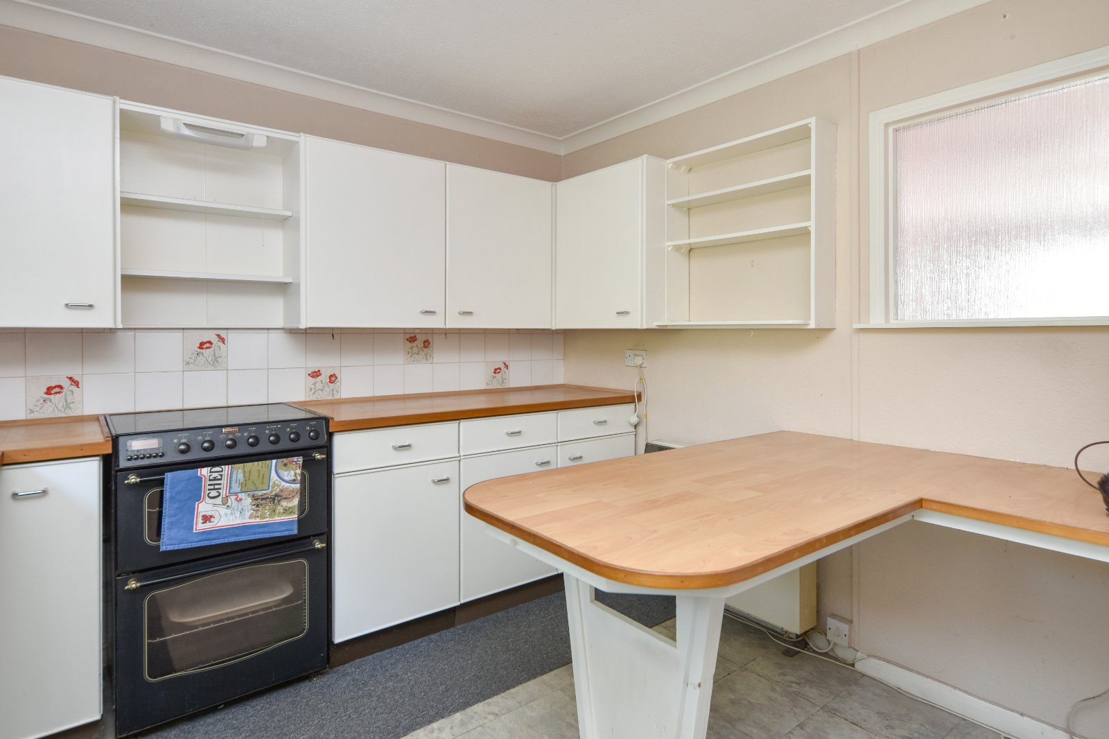 Glazed window to rear aspect. The Kitchen comprises a range of eye and base level units with wood effect worksurfaces over inset with sink unit with mixer tap over. Freestanding 'Stoves' double oven with four ring electric hob. Undercounter 'Bendix' washing machine (to remain). Breakfast bar seating area. Storage heater. Textured ceiling.