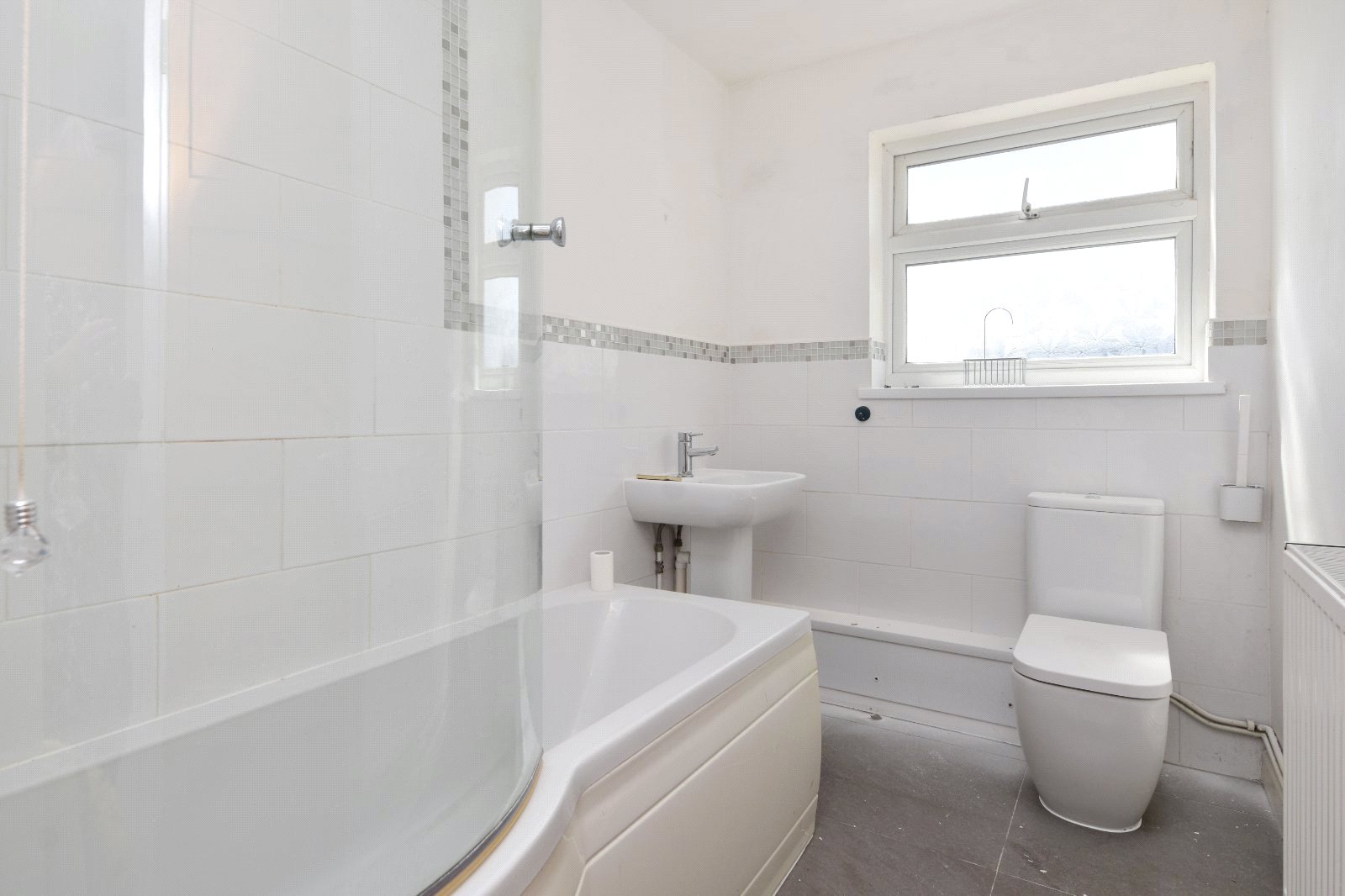 Obscure uPVC double glazed window to side aspect. The suite comprises a panelled enclosed 'shower bath' with mixer taps and integrated shower over with fitted curved shower screen, pedestal wash hand basin with mixer tap over and low level dual flush wc. Tiled flooring. Radiator. Partly tiled walls with attractive border tile inlay. Smooth plastered ceiling inset with recessed lighting.