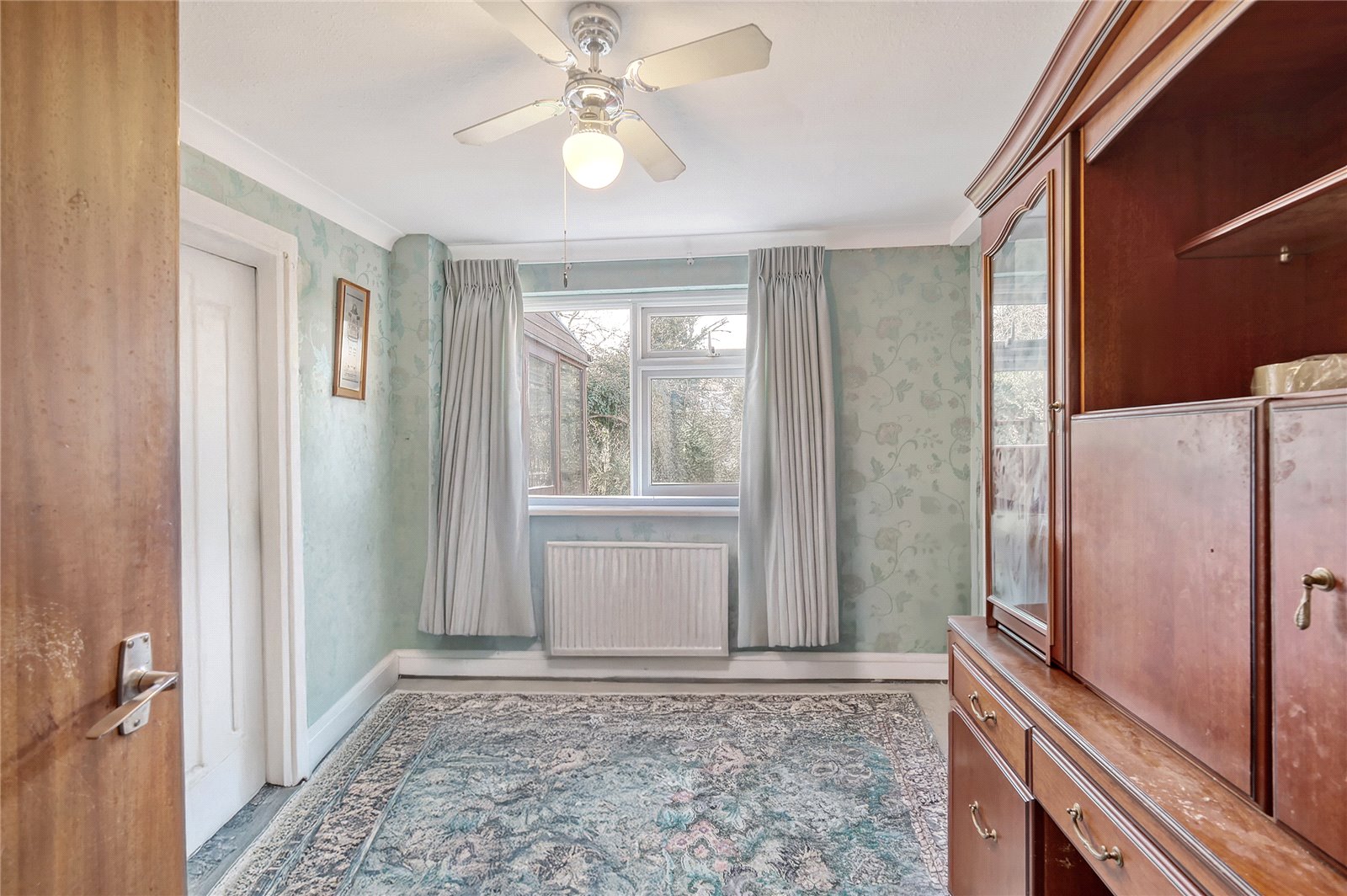uPVC double glazed window to rear overlooking the rear garden. Radiator. A pair of doors gives access to the sitting room. Glazed servery from the kitchen. Coved cornice to ceiling.
