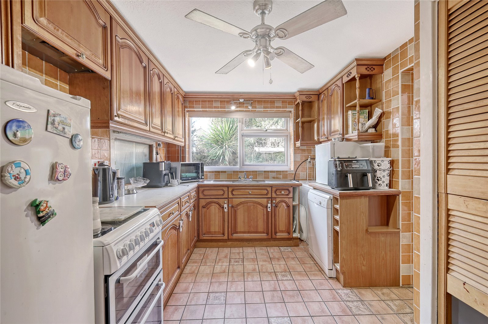 uPVC double glazed window to rear, and an obscure double glazed door gives side access to lean to walkway, with obscure double-glazed doors giving front and rear access to the property, with tiled floor and Perspex Reflectolite roof. The kitchen is fitted with a range of base and pelmetted eyelevel cabinets in oak with wood trim working surfaces and inset double drainer stainless steel sink unit with mixer tap. Space and supply for gas/electric cooker. Space for upright fridge/freezer. Space, plumbing and drainage for automatic washing machine and further appliances. Floor standing Baxi gas boiler serving domestic hot water and central heating system. Fully tiled to walls and floor.