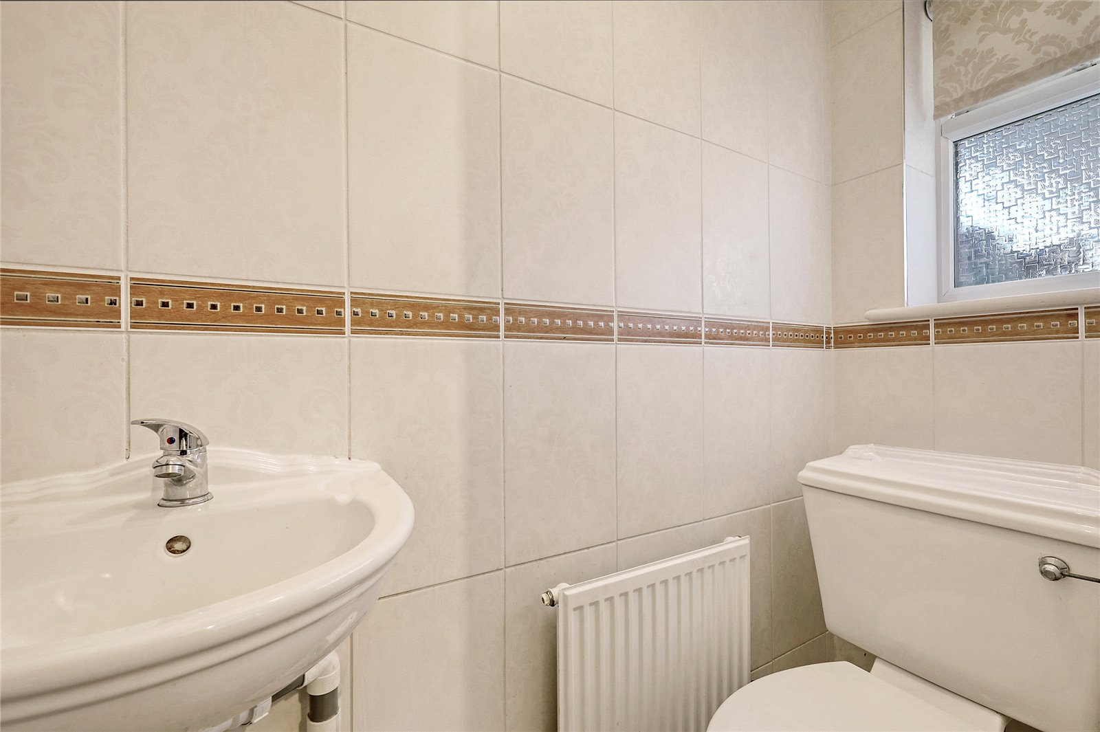 Obscure double glazed window to front. Radiator. Fitted with a two piece suite comprising close coupled WC, and suspended wash handbasin with mixer tap. Full ceramic tiling to walls with inset feature border tiles.