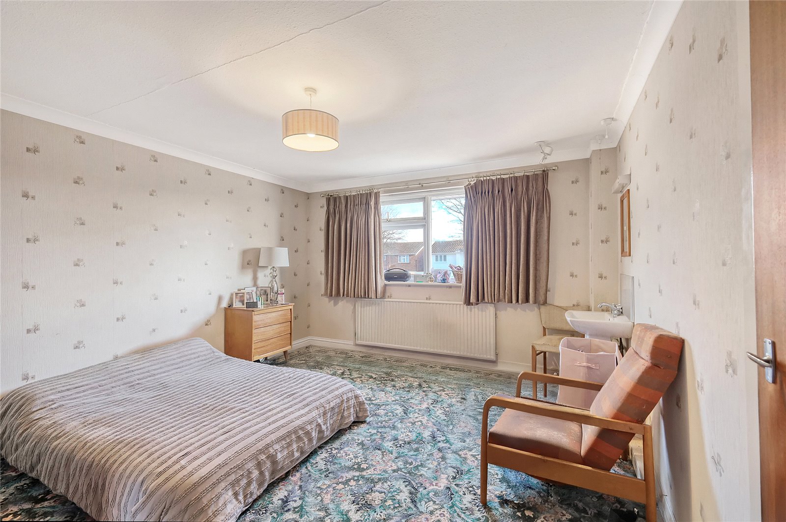 uPVC double glazed window to front. Radiator. Access to built in wardrobe cupboard. Pedestal wash handbasin with tiled splashback. Coved cornice to ceiling.