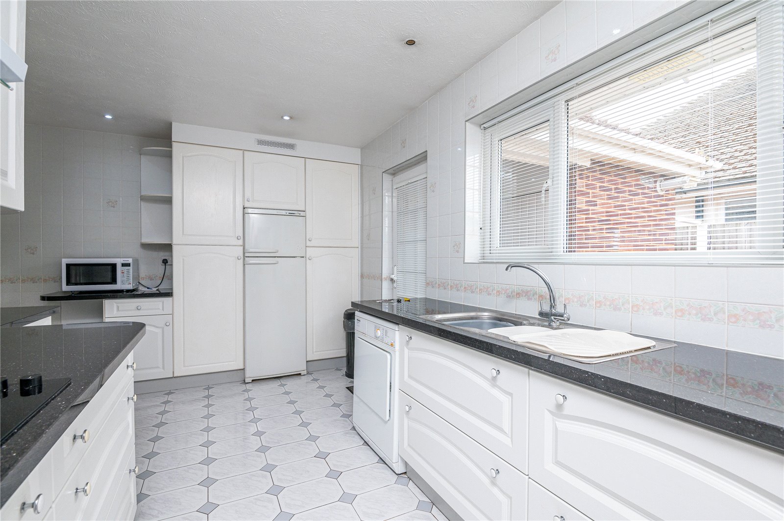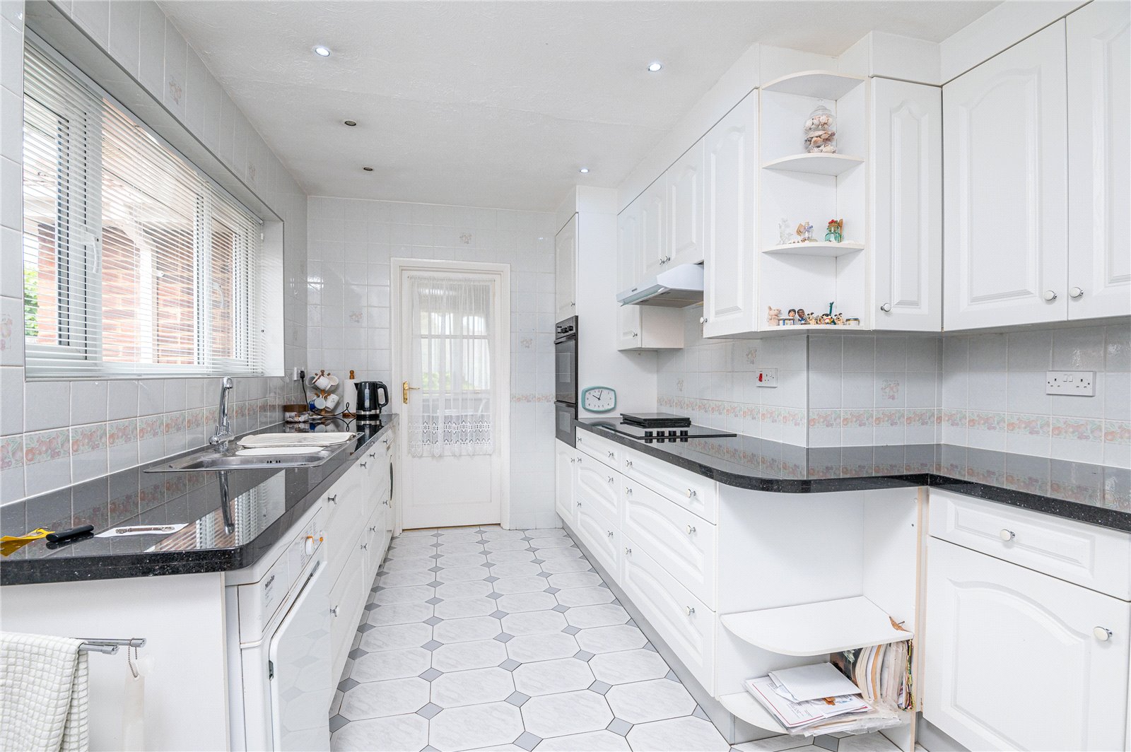 UPVC double glazed door to side provides access to rear garden. UPVC double glazed window to side. Kitchen is fitted with a range of base and eye level shaker style cabinets incorporating a granite working surface, inset one and a half bowl stainless steel sink with mixer tap and drainer unit. Inset four burner ceramic hob with fitted extractor hood above. Integrated electric fan assist double oven. Space and plumbing for washing machine and tumble dryer. Space for free standing fridge/freezer. Fully tiled floors and walls. Recessed LED lighting.