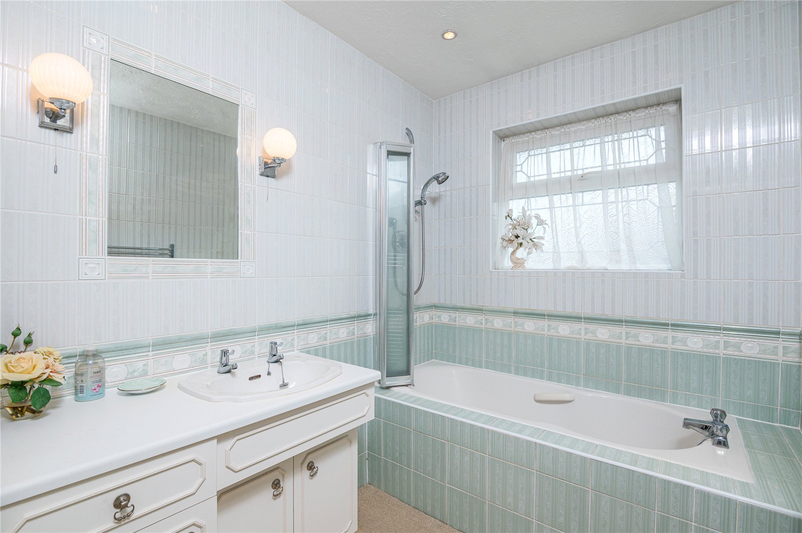 UPVC double obscured glazed window to side. Fitted with a two piece suite comprising vanity bar with wash hand basin and cupboards beneath and bath with mixer tap, plus separate wall mounted shower mixer with adjustable showerhead, glass shower screen. Wall mounted vanity mirror with wall mounted lighting adjacent. Chrome heated towel rail. Fully tiled walls. Recessed LED lighting.