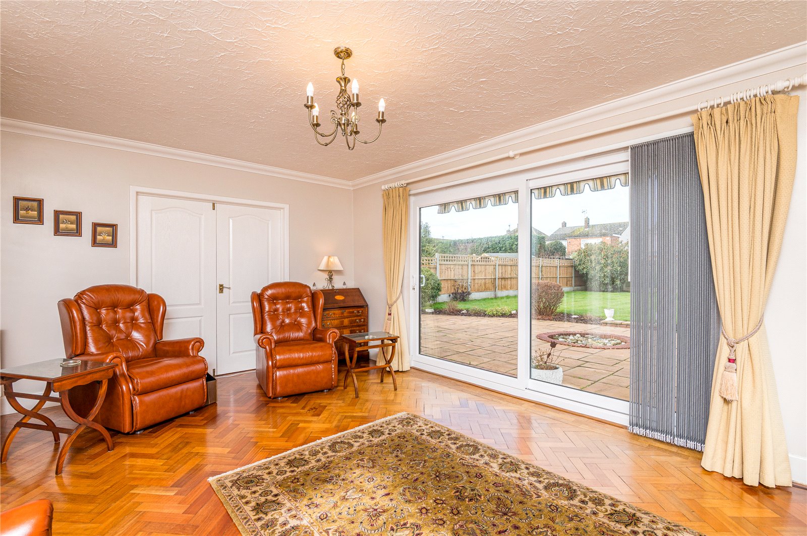 This bright and well proportioned living room has wide double glazed sliding patio doors framing lovely views across the rear garden. Herringbone pattern parquet flooring. Tiled fireplace with open grate. Coved ceiling. Two radiators. Double doors leading to:
