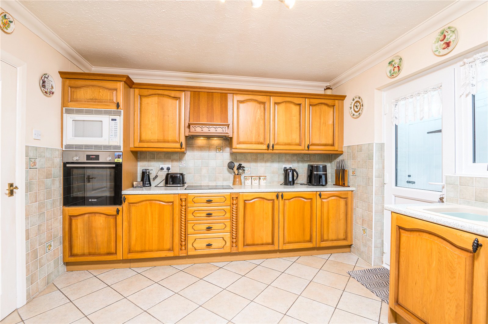 Fitted with a wide range of natural wood fronted units with rolled edge working surfaces with inset sink and mixer tap, cupboards below. Built in dishwasher with matching decor panel. Further rolled edge working surface with inset 'De-Dietiech'ceramic hob with extractor hood above. Cupboards and drawers below with built in refridgerator with matching decor panel. Oven housing with built in 'Bosch' oven and 'Panasonic' microwave with cupboards above and below. Matching wall mounted storage cabinets. Half tiled walls. Tiled floor. Radiator. Coved ceiling. Double glazed window and door to covered sideway giving access to front and rear plus utility room.