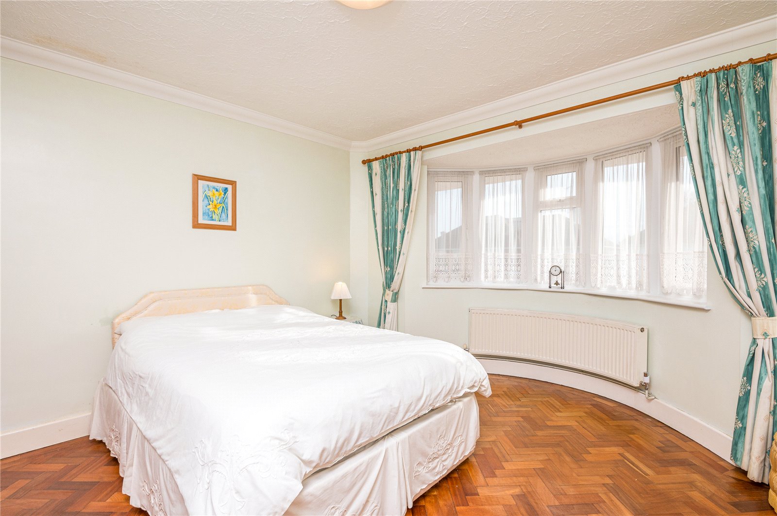 Overall size and into wide curved double glazed window to front. This lovely, bright double bedroom has Herringbone pattern parquet flooring. Radiator. Coved ceiling.