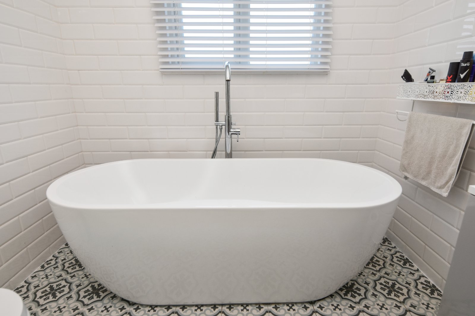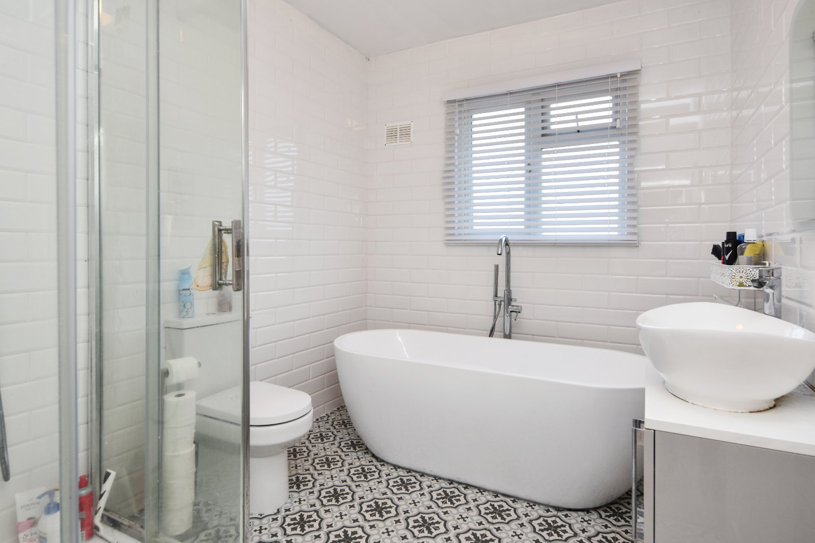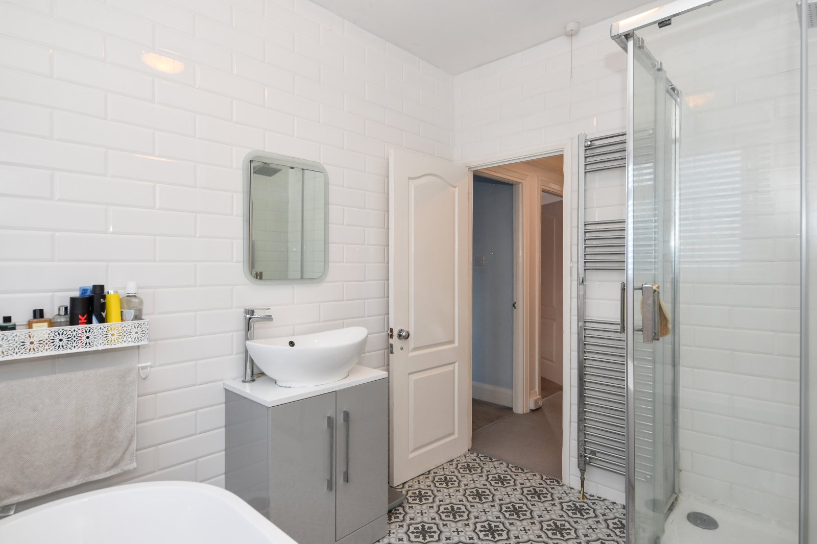 Obscure uPVC double window to rear aspect. The beautiful modern four piece bathroom suite comprises a freestanding bath with floor mounted mixer tap with hand held shower attachment, independent tiled shower enclosure with integrated shower unit with drencher shower head over and additional hand held shower head, feature counter top wash hand basin with mixer tap over and storage cupboards under and dual flush wc. Attractive tiled flooring. Ladder style heated towel rail. Radiator. Tiling to all visible walls. Smooth plastered ceiling.