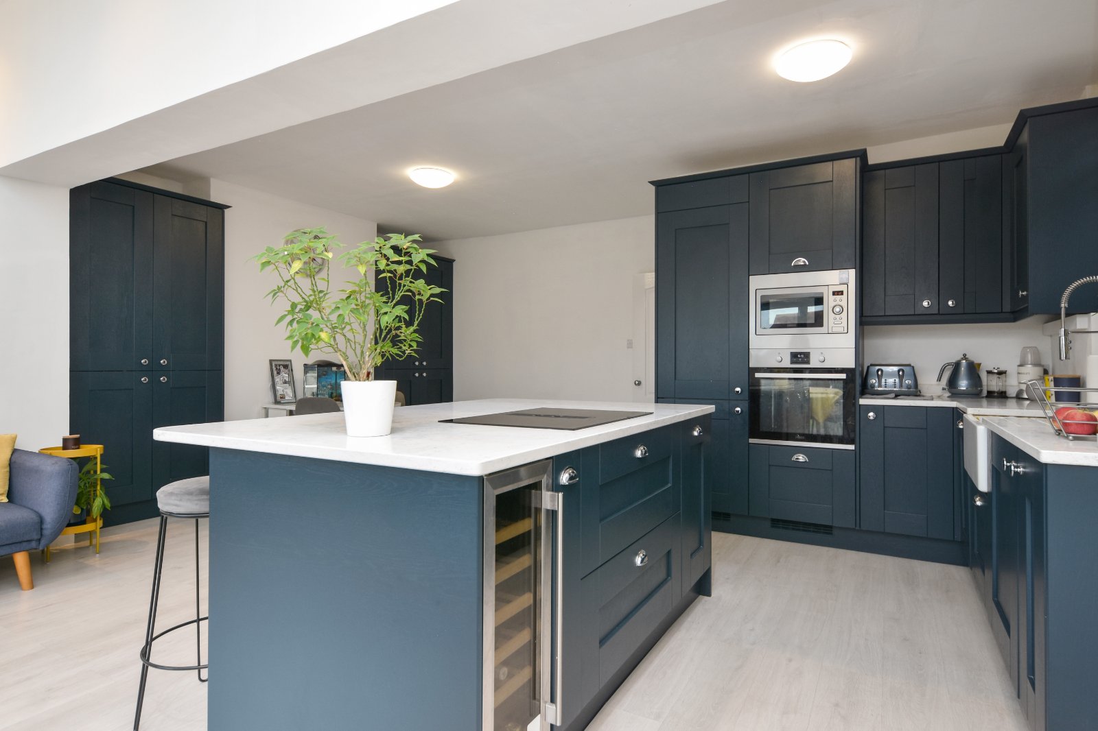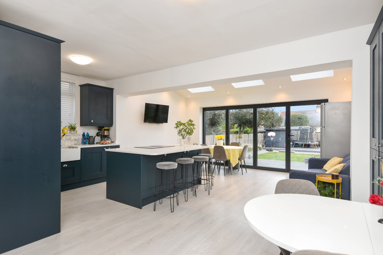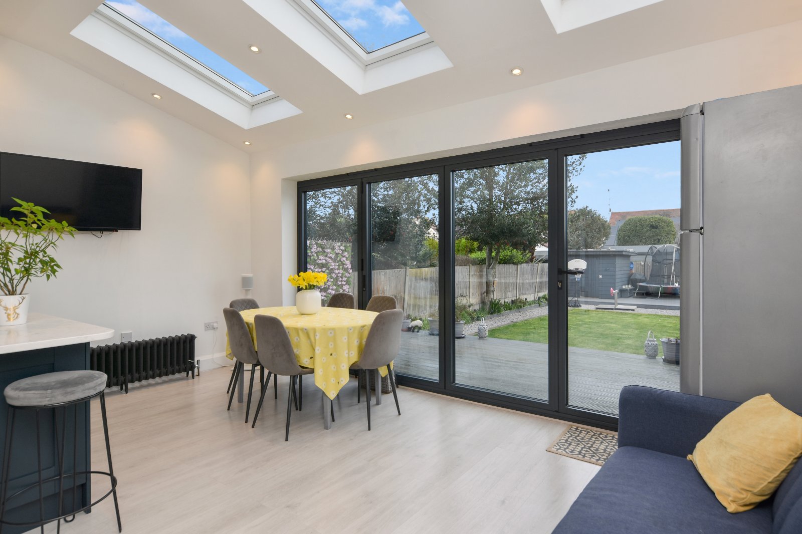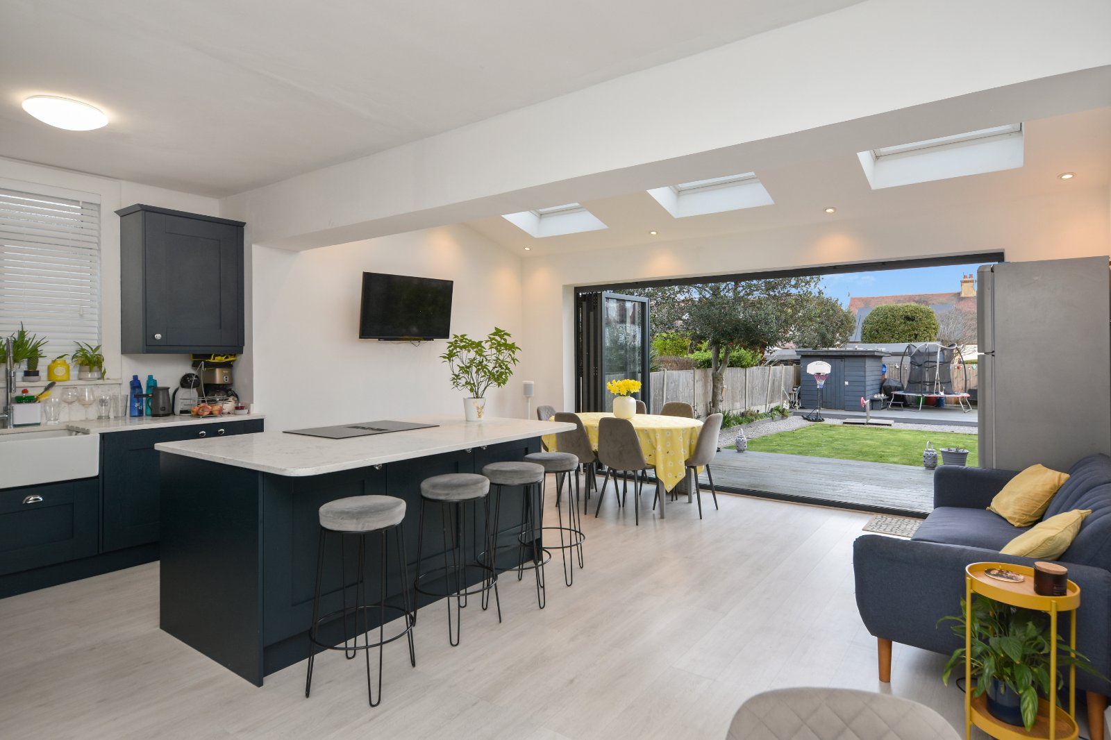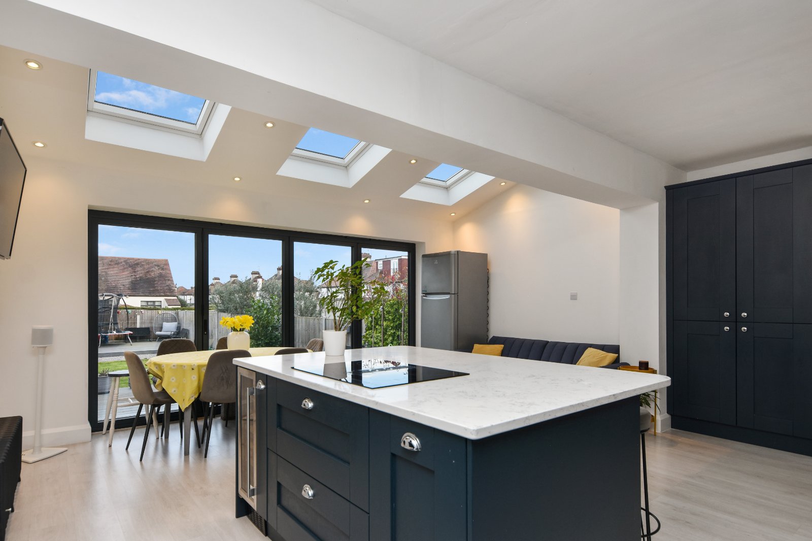 Almost full width bi-fold doors to the rear providing access to the rear Garden. Obscure uPVC double glazed window to side aspect. The Kitchen area comprises a range of eye and base level coloured cabinetry with granite working surfaces over inset with butler style sink unit with designer style mixer tap over. Under counter slimline dishwasher. Under counter integrated washing machine. Built in 'Zanussi' electric oven with matching microwave over. A generous size Central Island providing a breakfast bar seating area with under counter slimline wine cooler under, pan drawers and 'pull out bin'. Granite worksurface over inset with four ring induction hob. Laminate wood effect flooring. Integrated upright fridge/freezer. Almost full height matching colour larder style cupboards built into alcove area with ample shelving. Pair of traditional style column radiators. Part vaulted smooth plastered ceiling inset with three double glazed skylights and recessed lighting.