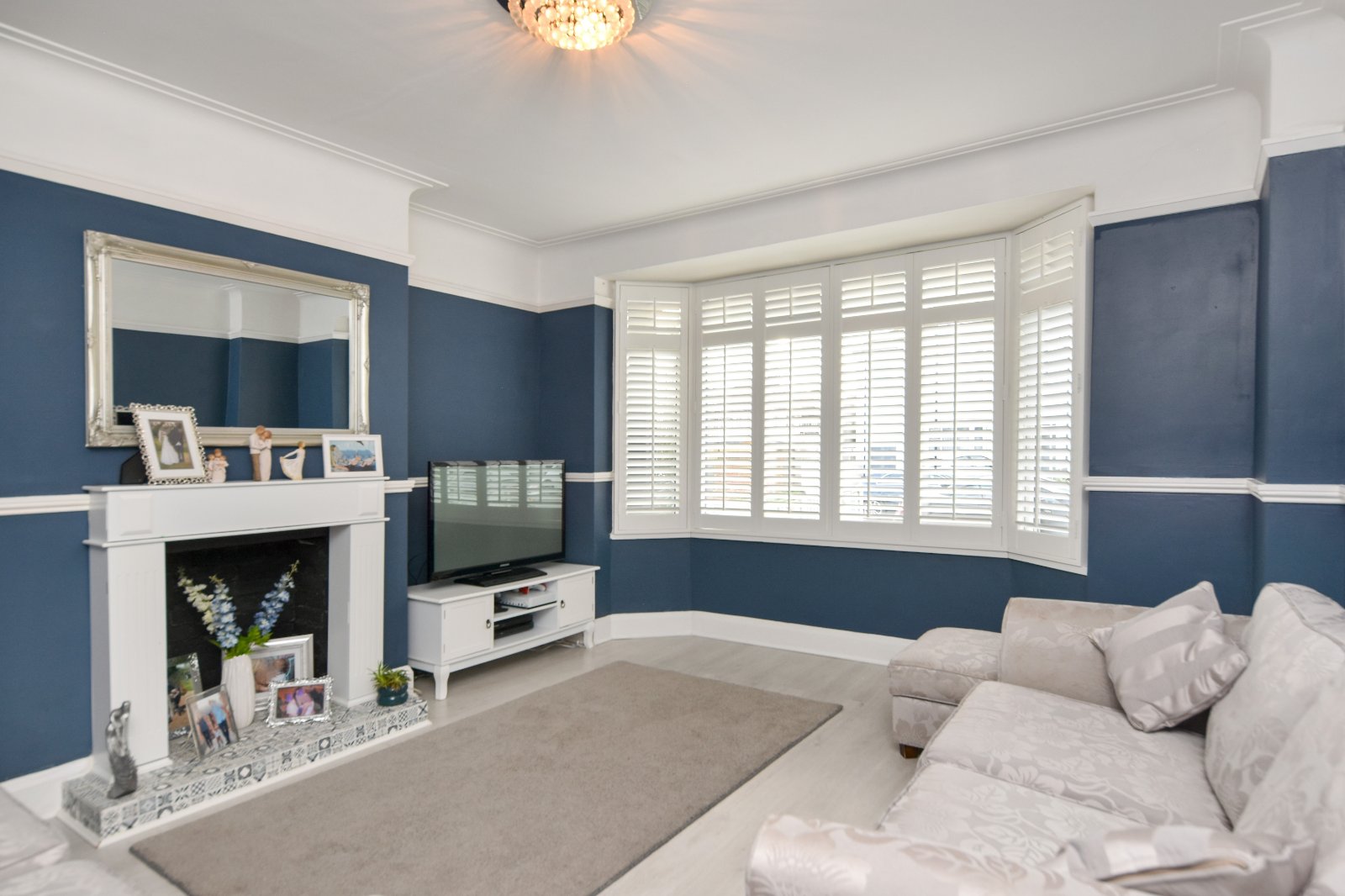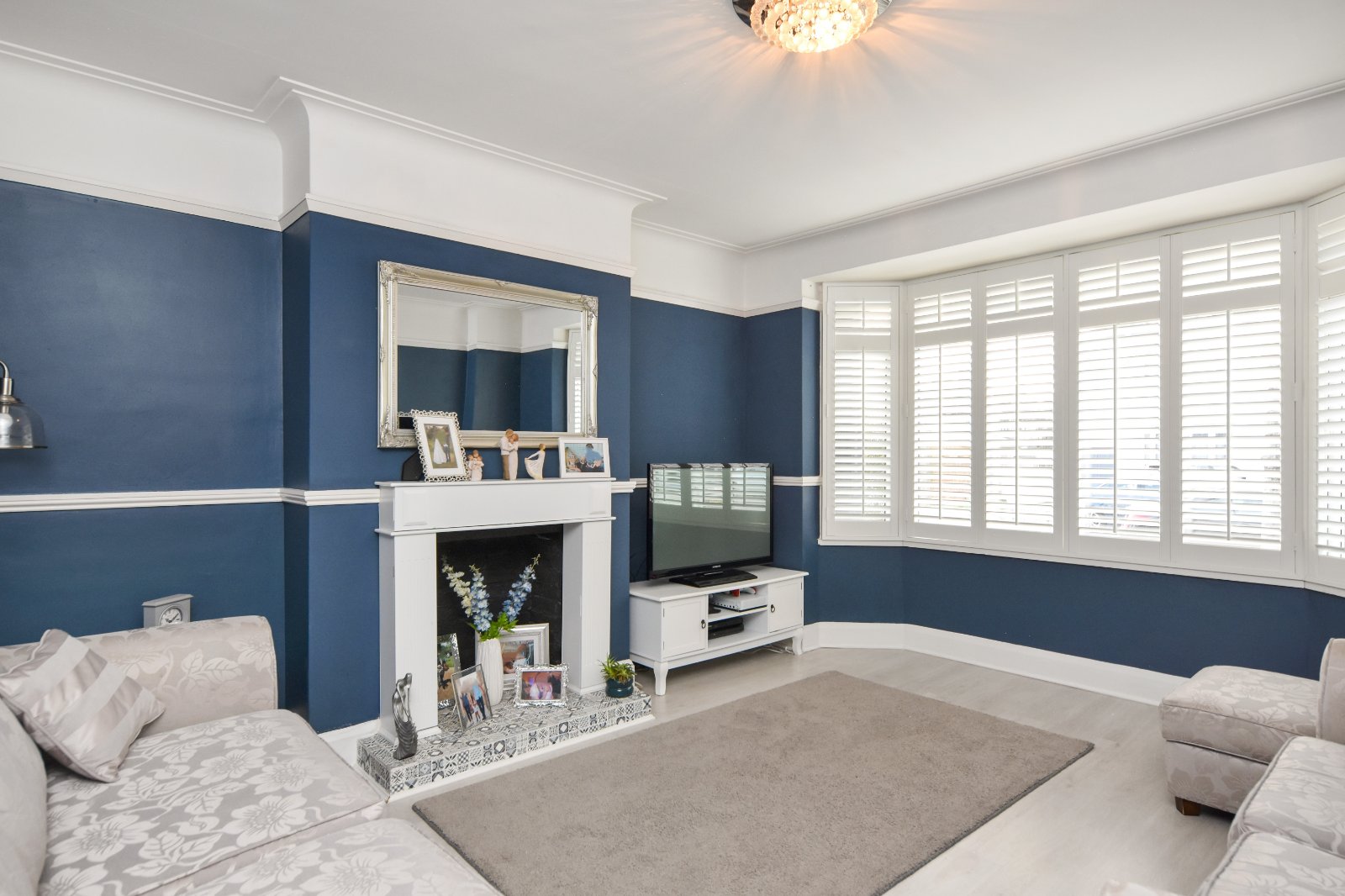 Attractive uPVC bay window to front aspect fitted with a range of made to measure fitted shutter blinds. Feature fireplace niche with decorative surround with mantle over inset with tile hearth. Radiator. Dado rail. Picture rail. Laminate wood effect flooring. Cornice to smooth plastered ceiling.