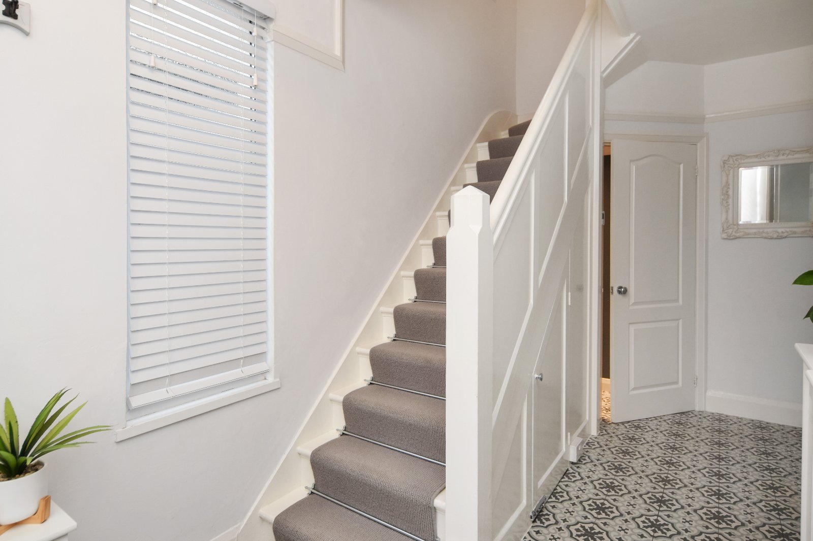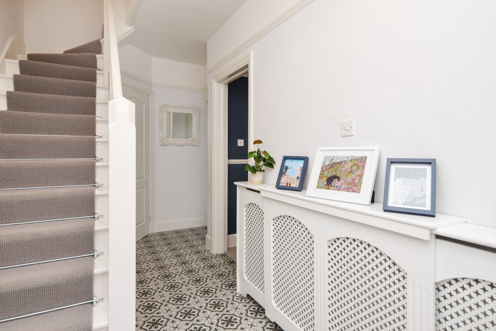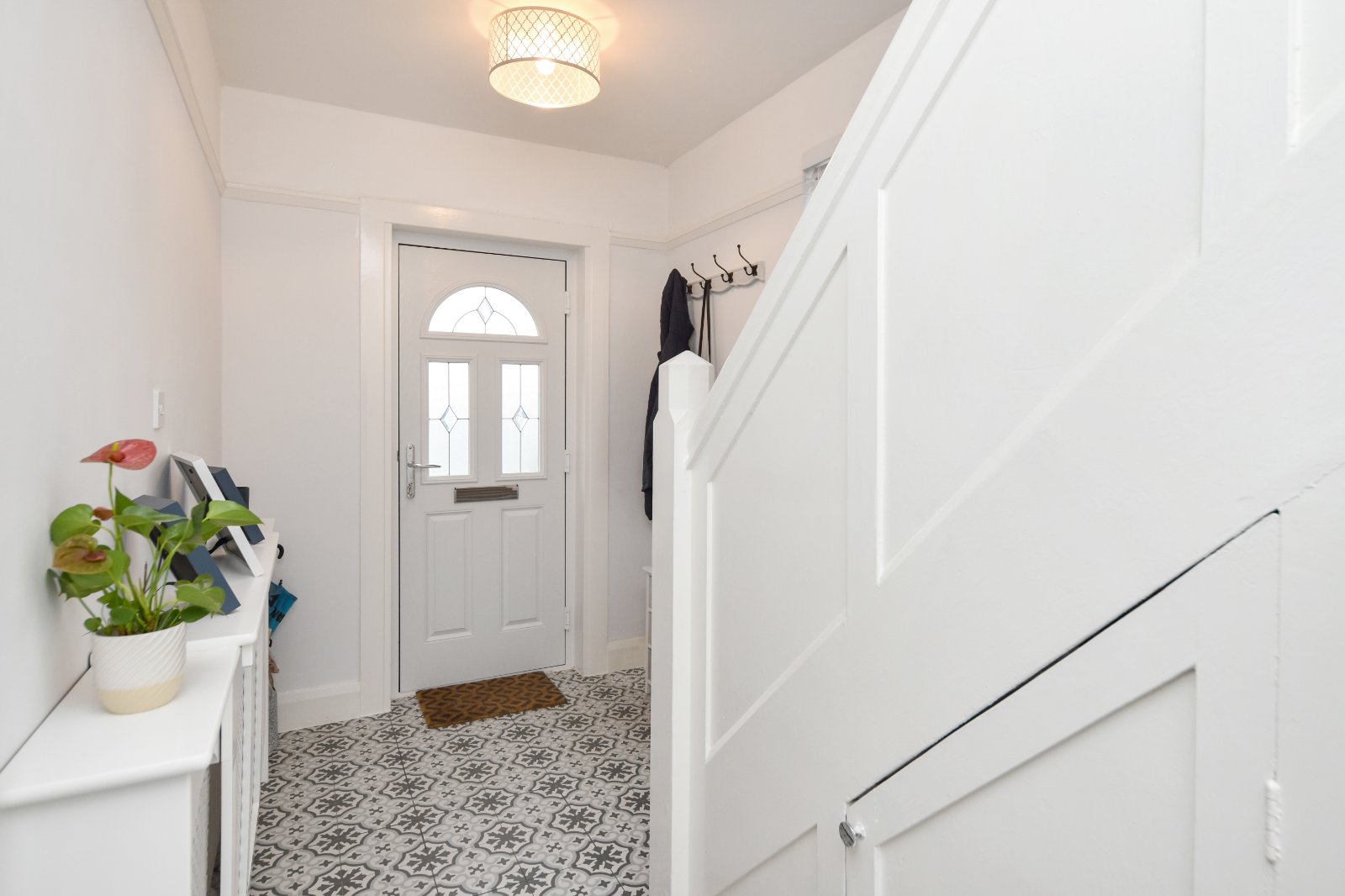 Obscure uPVC double glazed window to side aspect. Attractive tiled flooring. Radiator insert to decorative cabinet. Picture rail. Panelled doors to Living Room and Kitchen/Family Room. Stairs rising to first floor accommodation with fitted central carpet runner with attractive steel rods. Thermostat control panel. Door to under stair storage cupboard. Smooth plastered ceiling.