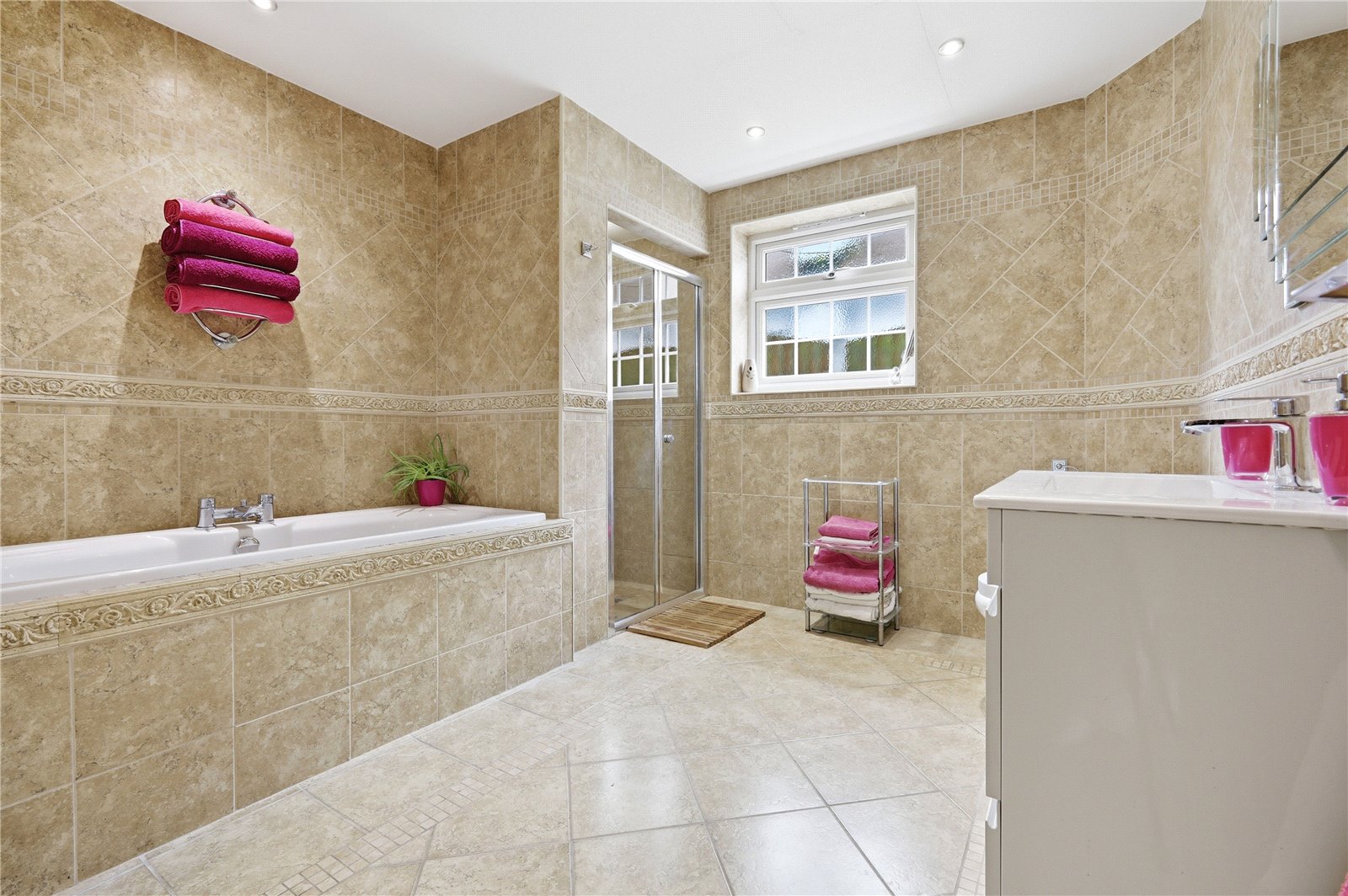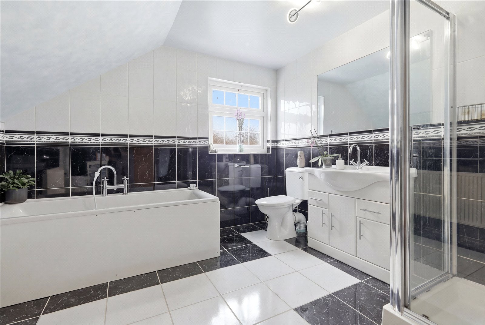 Opaque UPVC double glazed window to the side aspect. Fitted with a modern white four piece suite comprising of panelled enclosed bath with stainless steel mixer tap. Low flush WC. Vanity wash hand basin with draws and cupboard under and stainless steel mixer tap. Tiled shower cubicle with wall mounted shower unit and sliding door. Smooth plastered ceiling with inset recess spot lighting. Extractor fan. Tiling to walls. Ceramic tiled floor. Single banked radiator. Eaves storage cupboard.
