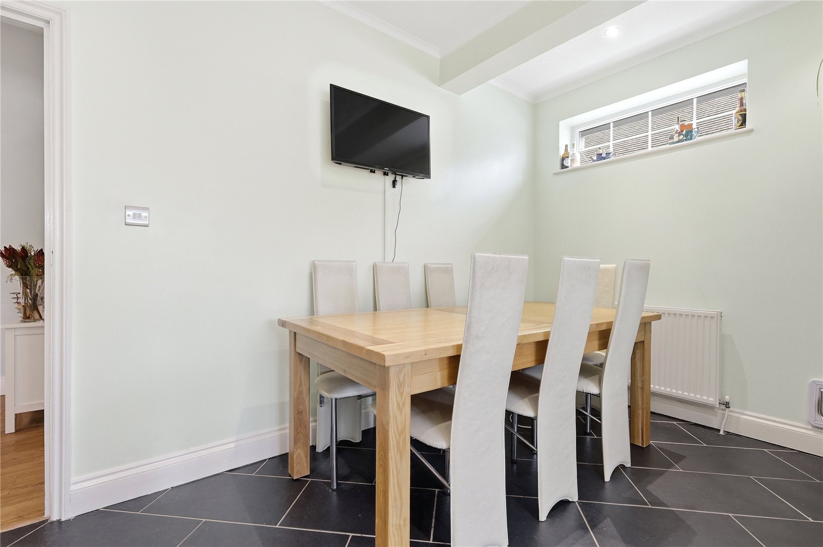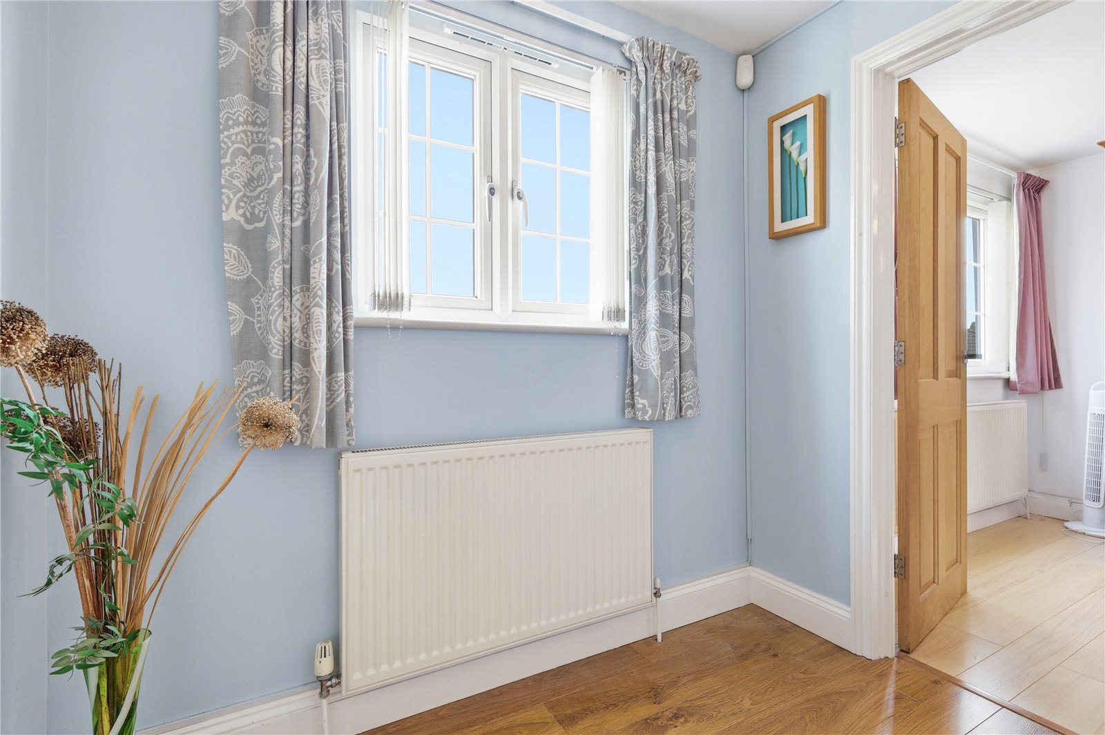 Coved cornicing with smooth plastered ceiling. Alarm control panel. Meter cupboard housing gas meter, electricity meter and fuse board with trip switch. Wall mounted central heating thermostat. Double banked radiator. Stairs leading to first floor accommodation and four panelled doors leading to rooms.