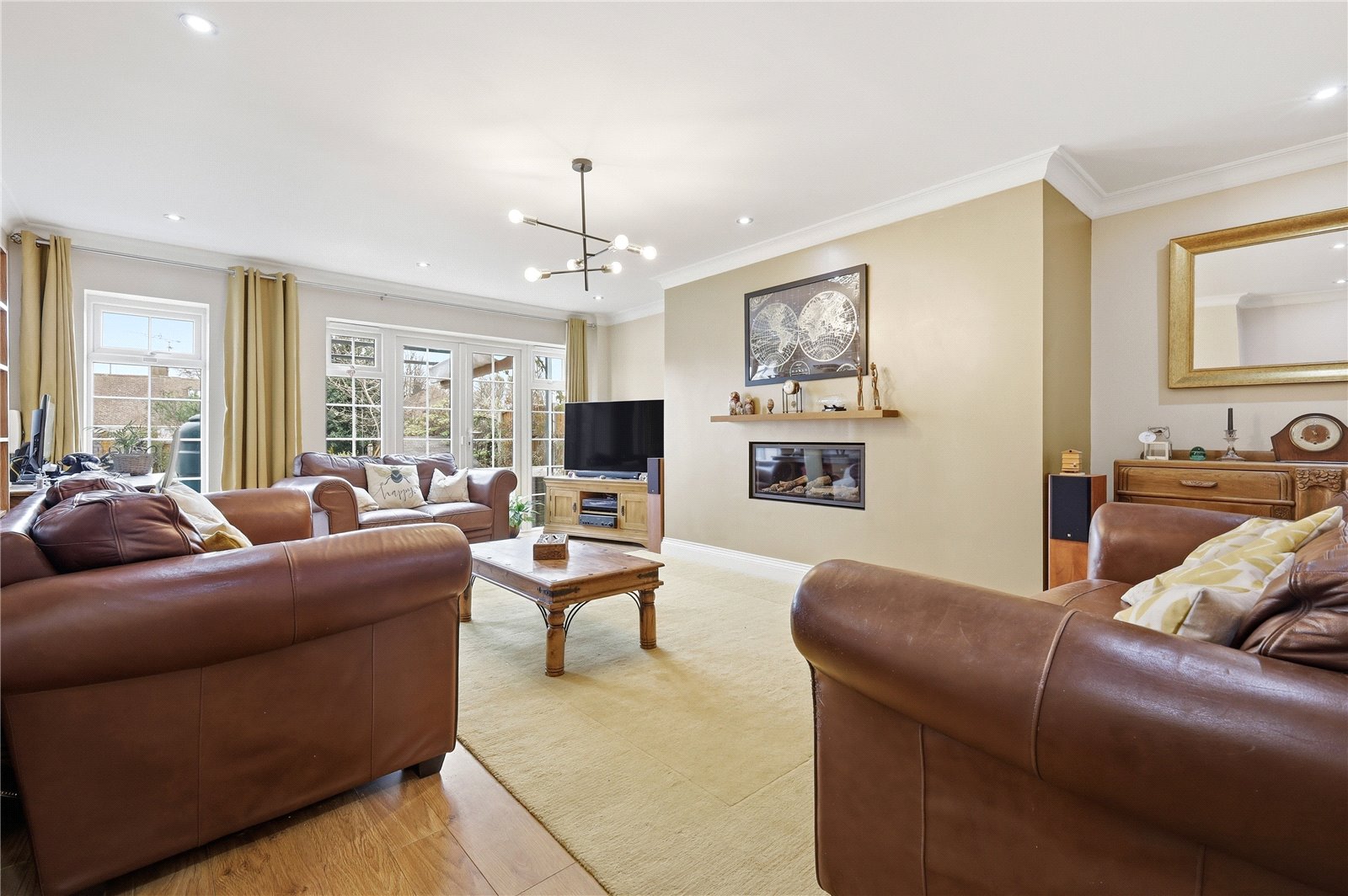 UPVC double glazed French doors to the rear aspect with windows adjacent gives access to a block paved patio area. Coved cornicing with smooth plastered walls and ceiling with inset spot lighting. Laminate wood effect flooring. Feature fireplace with inset gas log effect fire. Internet point. Television aerial point. Double banked radiator.