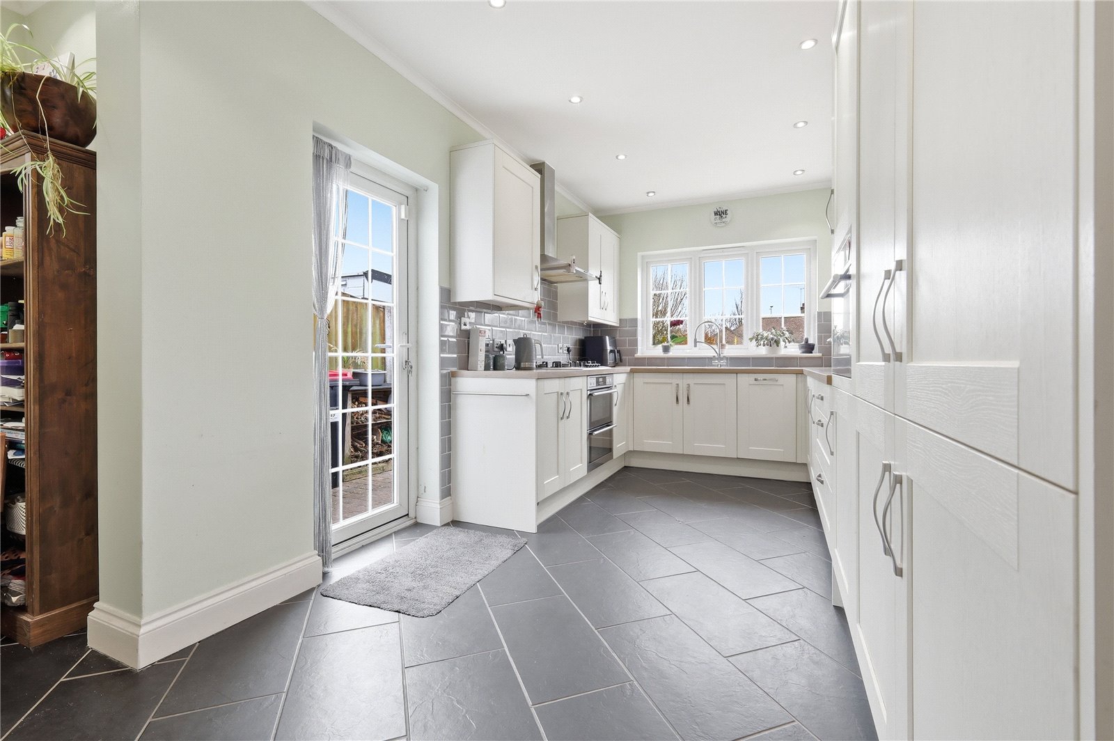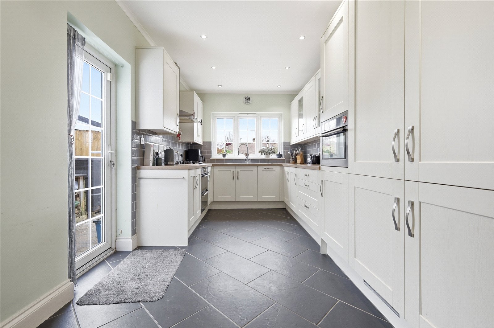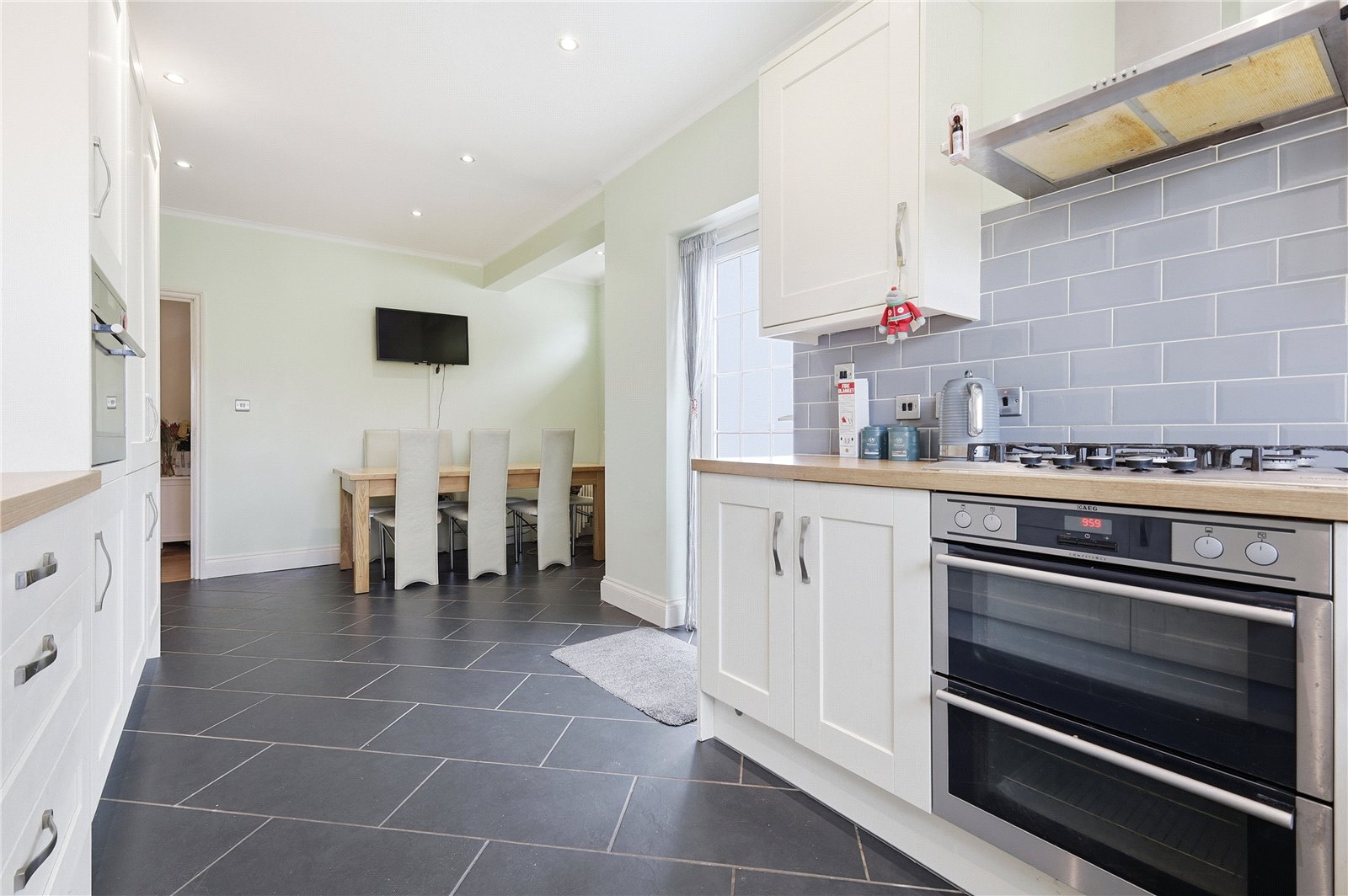 UPVC double glazed window to the rear and side aspect with door giving access to the rear garden. The kitchen is modern and fitted with a wood work surface incorporating stainless steel one and half bowl single drainer sink with mixer tap and pull out plate rinser. Integrated five ring gas burner and oven. integrated Combi oven/microwave. Integrated dishwasher, washing machine and fridge and freezer. Further matching wall mounted storage units with glass fronted display doors. Part tiling to walls. Coved cornicing with smooth plastered ceiling with inset spot lighting. Ceramic tiled floor. Single banked radiator. Television aerial point.