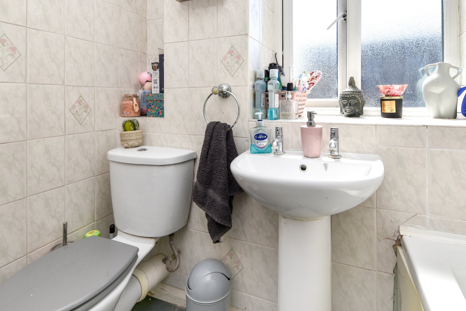 Obscure uPVC double glazed window to side aspect. The white three piece suite comprises a panelled enclosed bath with mixer taps over and with wall mounted 'Mira' shower with fitted shower screen, pedestal wash hand basin and low level WC. Radiator. Tiled flooring. Textured ceiling inset with ceiling mounted extractor fan. Access to loft space.