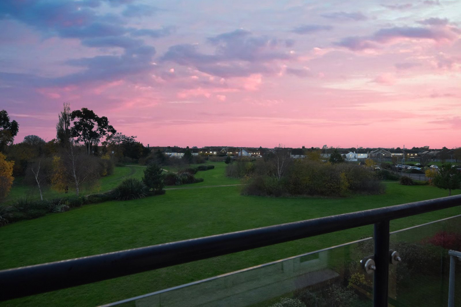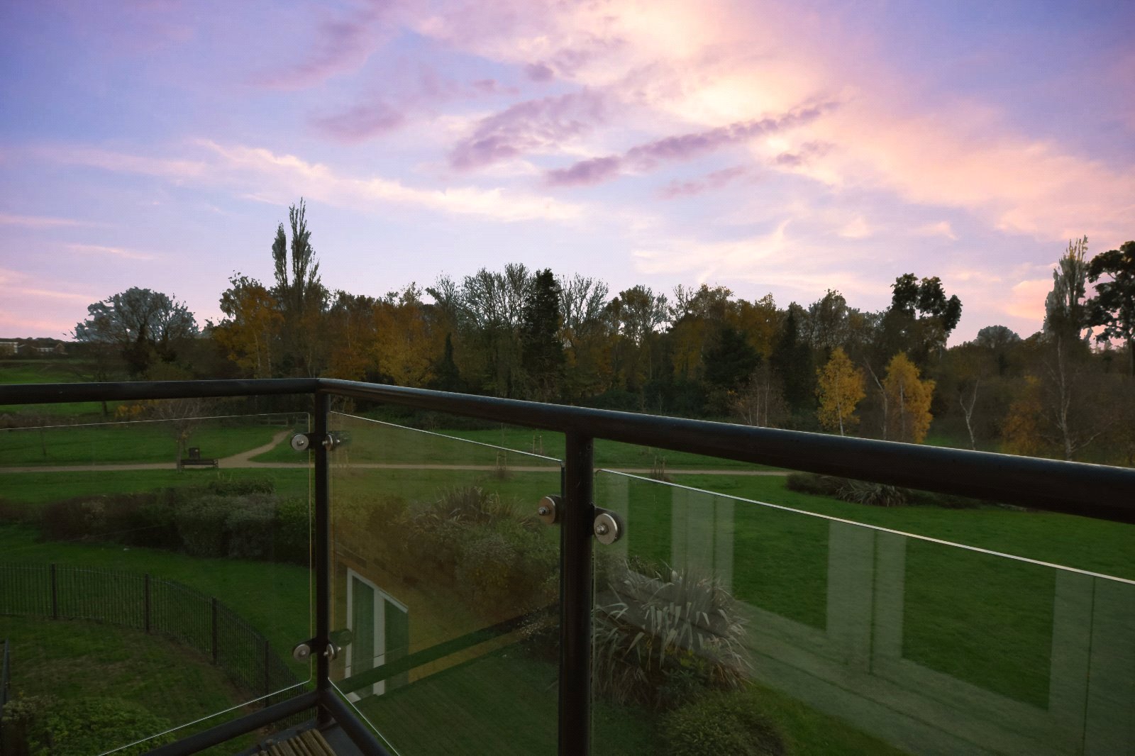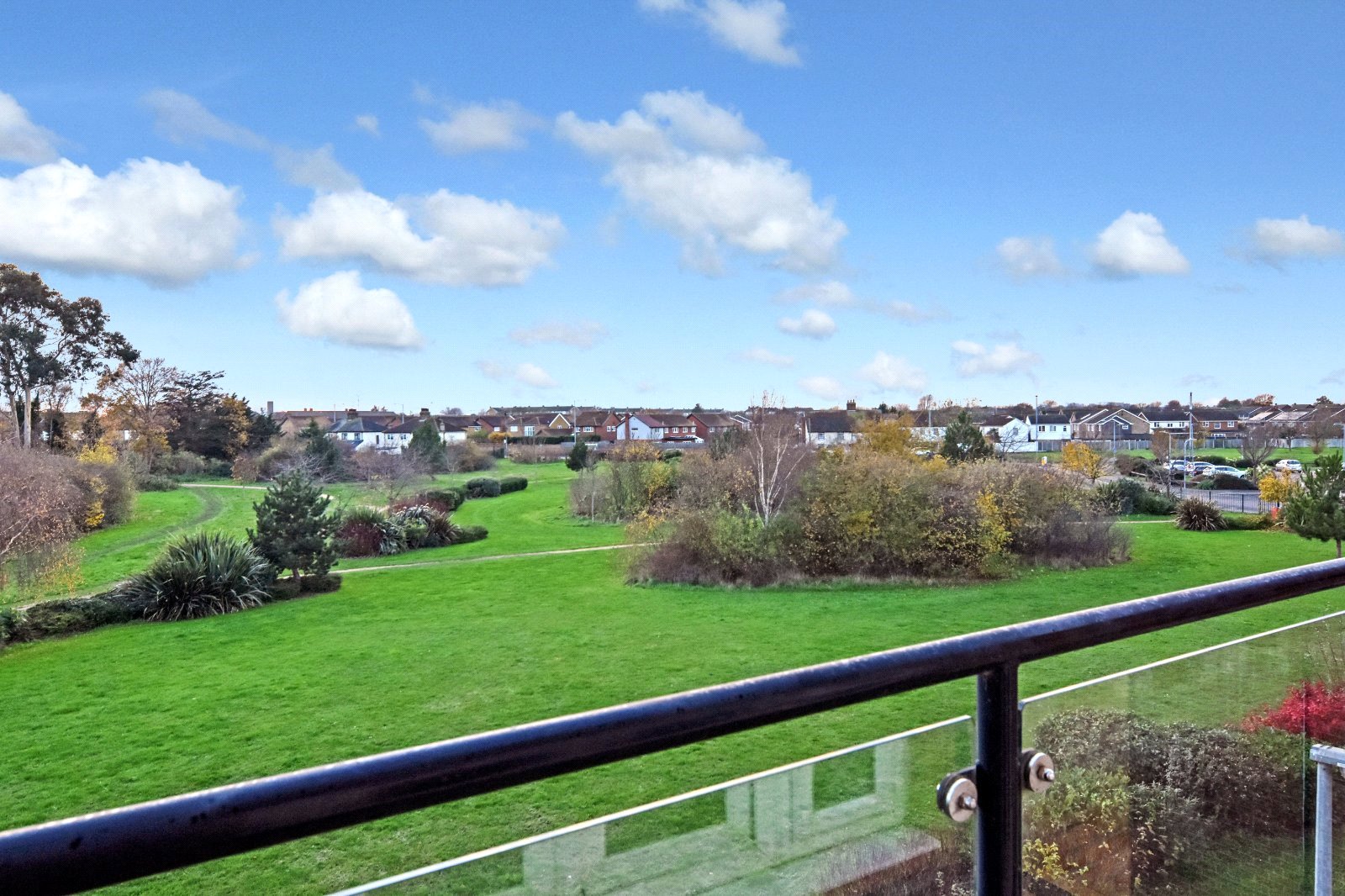 South / West facing balcony. Contemporary steel hand rails with attractive glass inserts. Timber decked base. Wonderful open views over parkland.