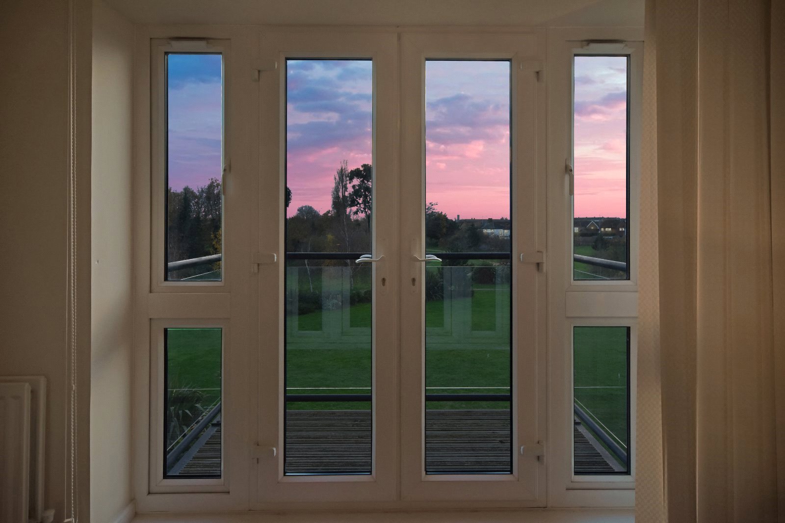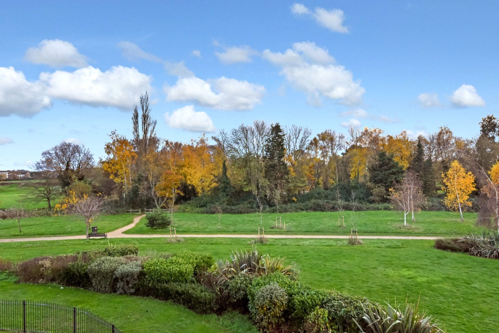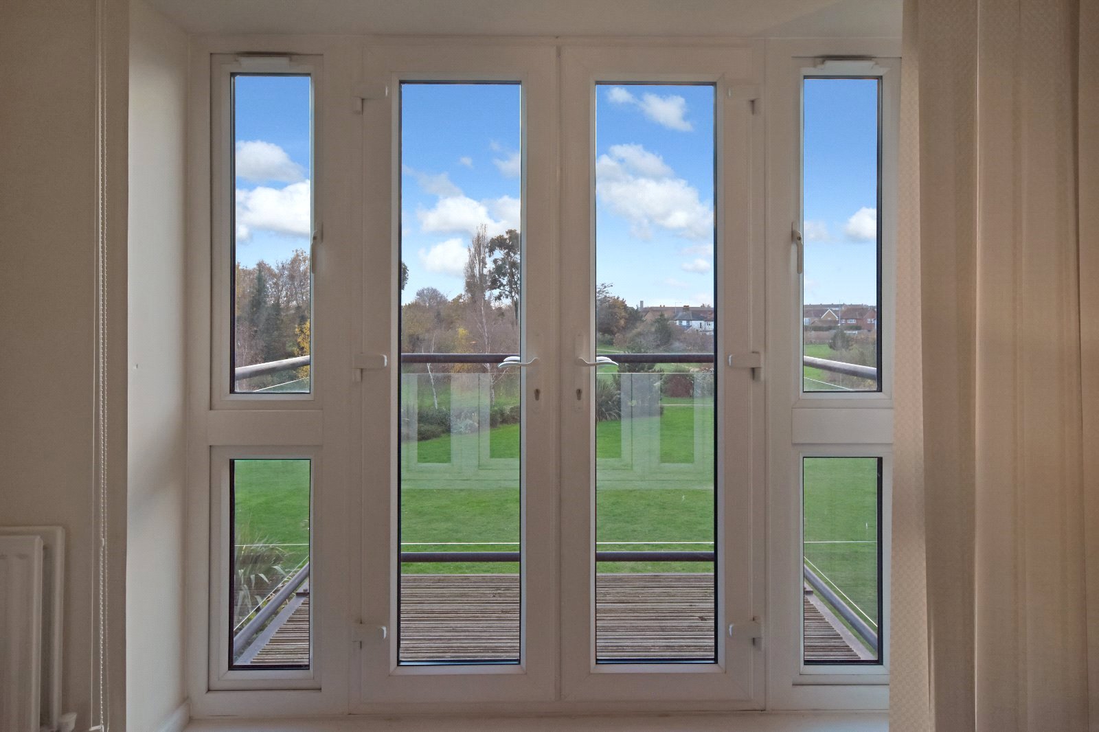 South / West facing balcony. Contemporary steel hand rails with attractive glass inserts. Timber decked base. Wonderful open views over parkland.