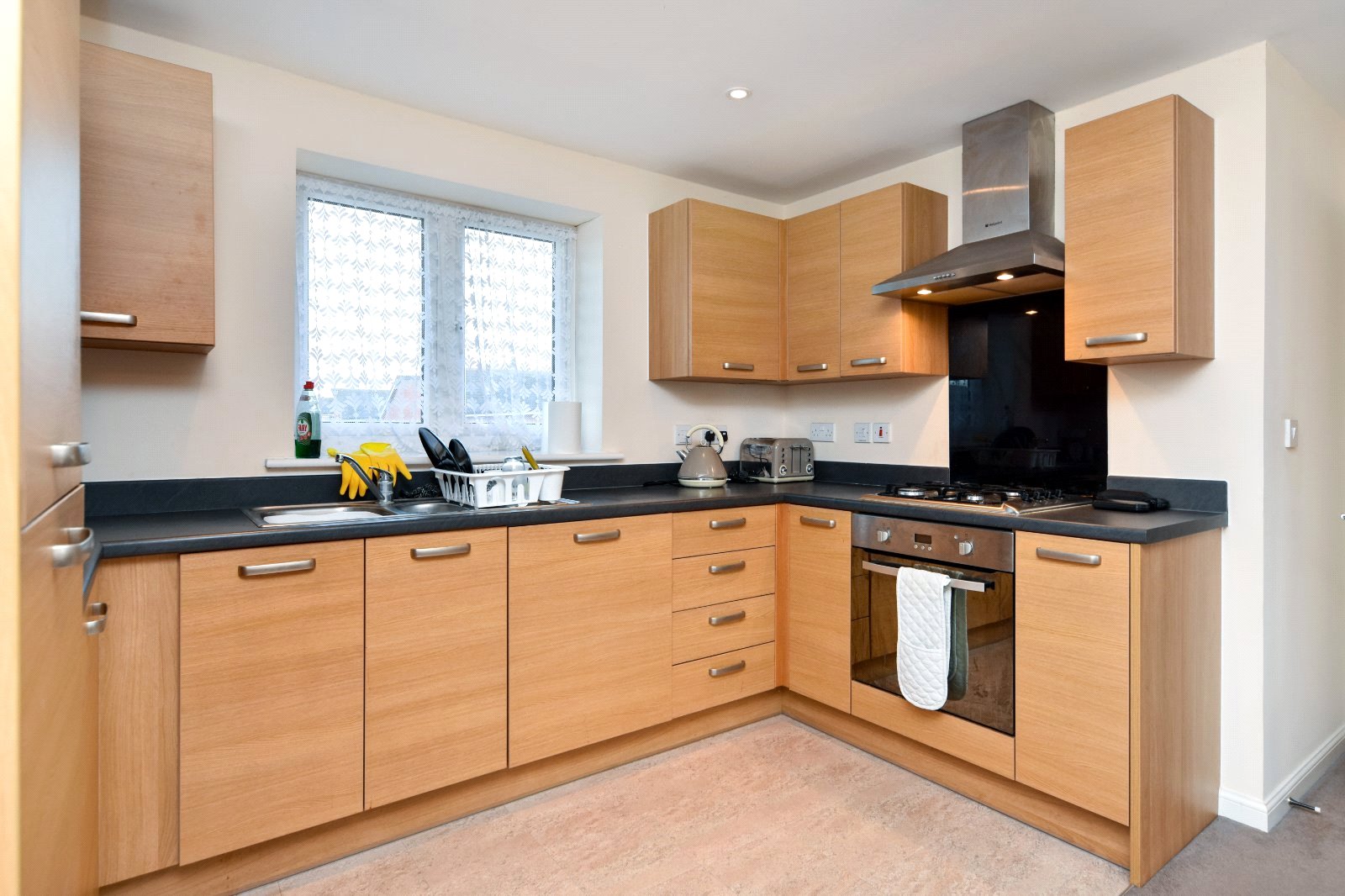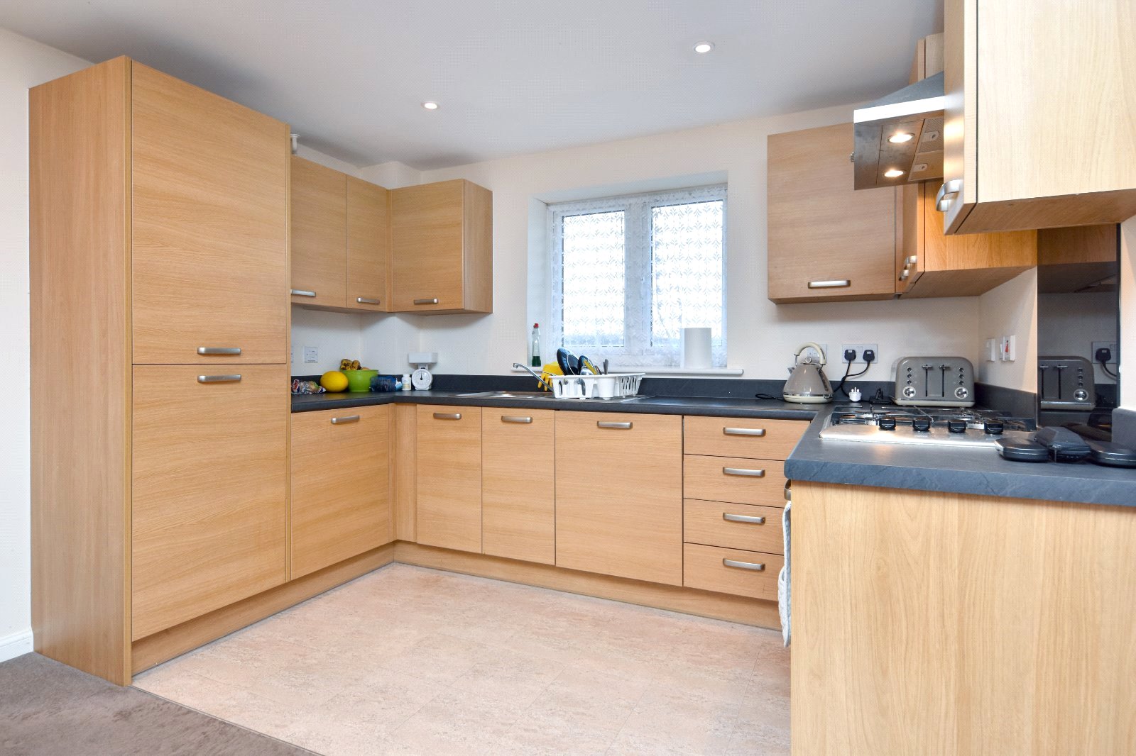 uPVC double glazed window to rear aspect. The Kitchen is fitted with a modern range of eye and base level units with rolled edge working surfaces inset with stainless steel single drainer one-and-a-quarter sink unit with mixer tap over. Built in electric oven with four ring gas hob over with attractive glass splashback and 'Hotpoint' stainless steel extractor canopy over. Integrated appliances include; upright fridge/freezer and washing machine. Smooth plastered ceiling inset with recessed spot lights.