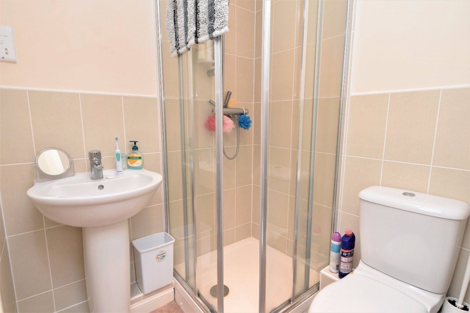 The modern white three piece suite comprises dual flush low level wc, pedestal wash hand basin with mixer tap over and independent shower enclosure inset with integrated thermostatic controlled shower. Partly tiled walls. Shaver point. Radiator. Wall mounted extractor fan. Smooth plastered ceiling inset with recessed lighting.