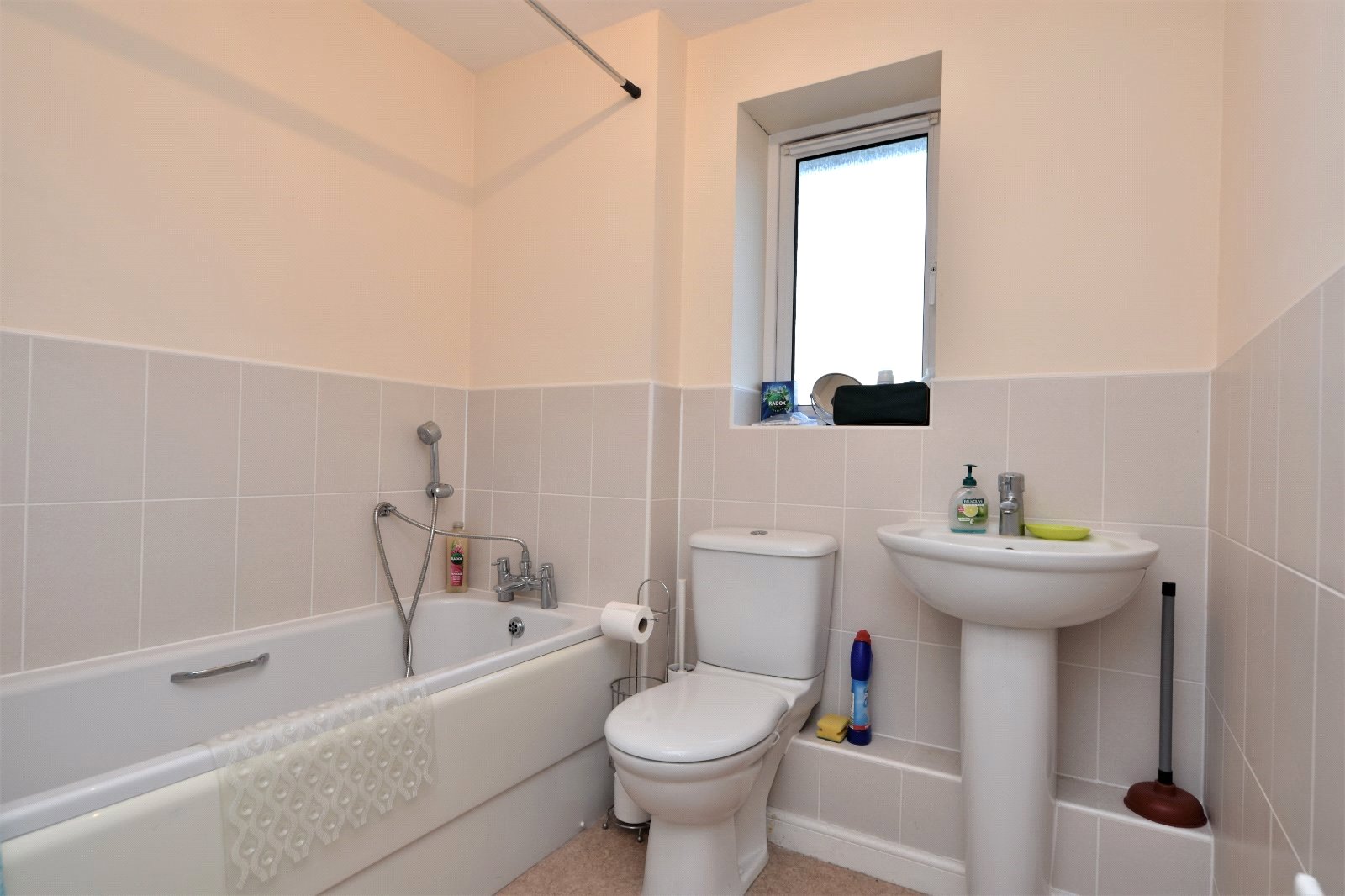 uPVC obscure double glazed window to front aspect. The modern white three piece suite comprises dual flush low level wc, pedestal wash hand basin with mixer tap over and panelled enclosed bath with mixer tap over with hand held shower attachment. Partly tiled walls. Radiator. Smooth plastered ceiling inset with recessed lighting.
