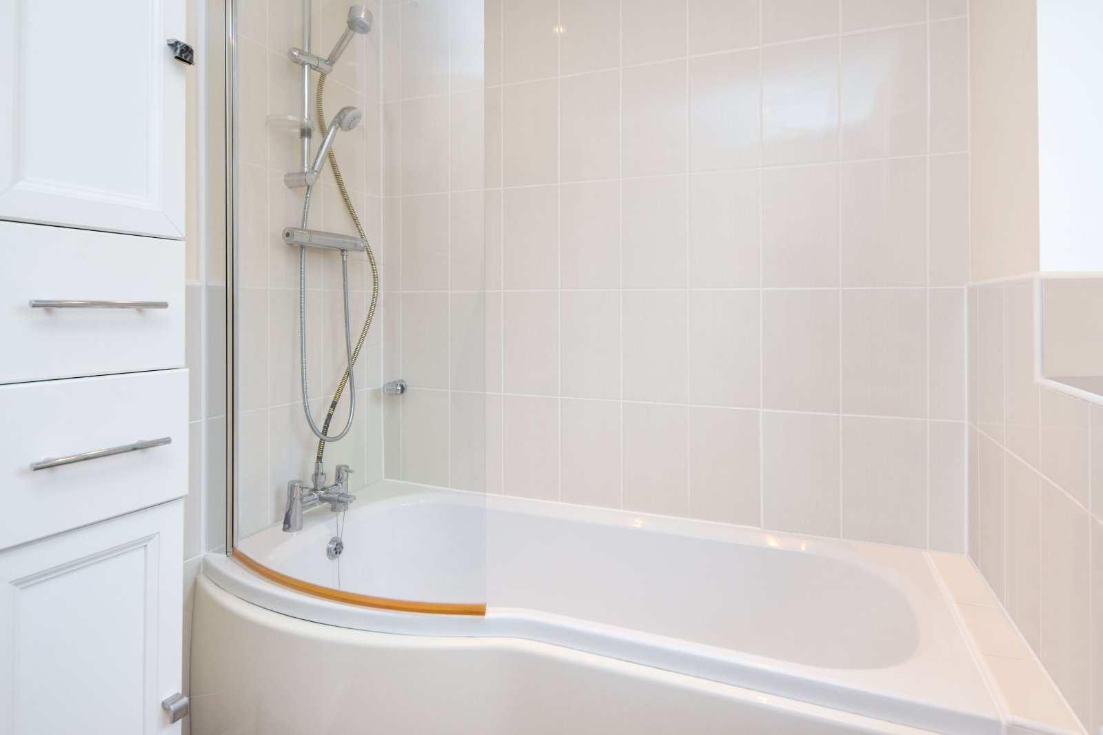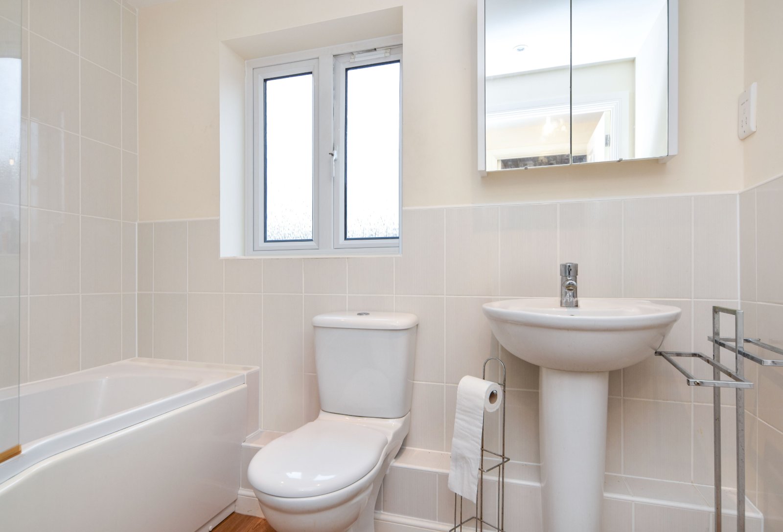 Obscure uPVC double glazed window to rear aspect. The white modern three piece suite comprises 'P' shaped shower bath with fitted shower screen, with mixer taps over and integrated shower unit over, pedestal wash hand basin with mixer taps over and dual flush WC. Partly tiled walls. Shaver point. Wall mounted mirror fronted cabinet. Radiator. Ceiling mounted extractor fan. Partly tiled walls. Wood effect flooring. Smooth plastered ceiling inset with recessed lighting.