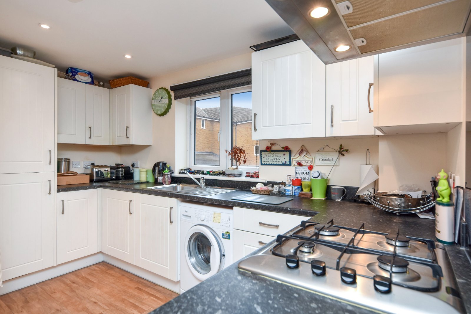 uPVC double glazed window to rear aspect. The kitchen is fitted with a range of eye and base level units with rolled edged working surfaces over inset with stainless steel single drainer sink unit with mixer tap over. Built in 'Hotpoint' electric oven with four ring gas hob over and brushed chrome wall mounted extractor canopy over with glass splashback. Under counter 'Whirlpool' washing machine. Integrated upright fridge/freezer. Wood effect flooring. Smooth plastered ceiling inset with recessed lighting.