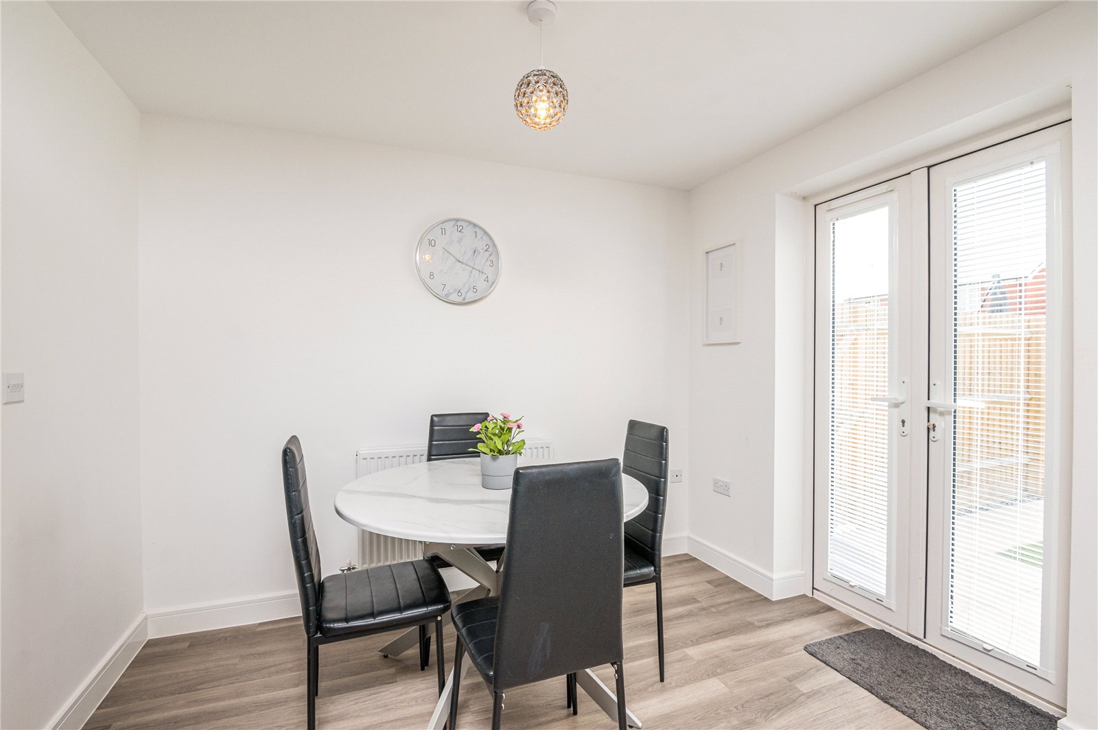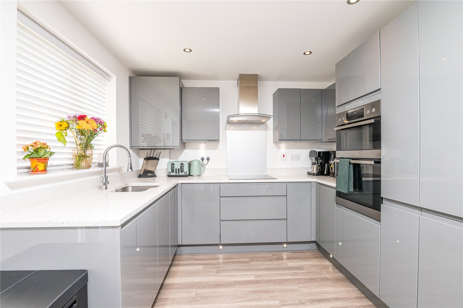 uPVC double glazed French doors to rear giving access to the garden, Further uPVC double glazed window to rear. The kitchen is fitted with a modern comprehensive range of base and eye level high gloss cabinets incorporating Quartz working surface. Plinth lighting. One and a half bowl stainless steel sink unit with mixer tap. Built in AEG induction hob with extractor canopy above. Integrated AEG fan-assisted electric double oven. Integrated dishwasher and fridge/freezer. Cupboard housing combination gas boiler serving domestic hot water and central heating system. Radiator. Wood effect Amtico flooring. High level skirting. Smooth plastered ceiling with recess Led lights.