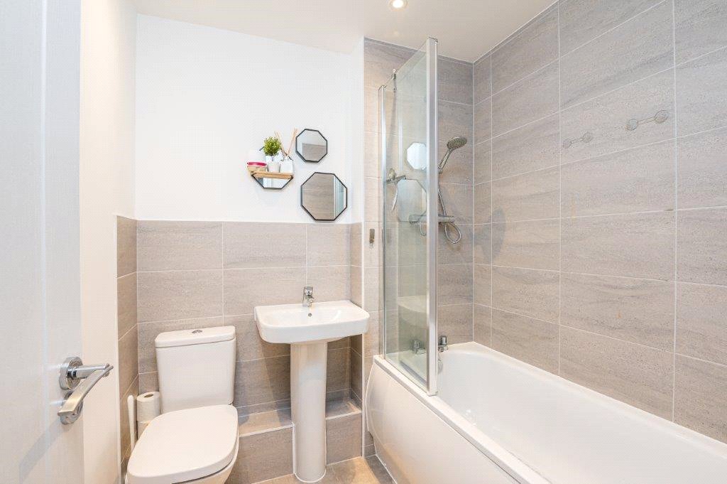 Fitted with a two piece suite comprising low level W/c, pedestal wash hand basin with mixer tap. Splash back tiling. Radiator. Wood effect Amtico flooring. High level skirting and smooth plastered ceiling with recess Led lighting. Extractor fan.