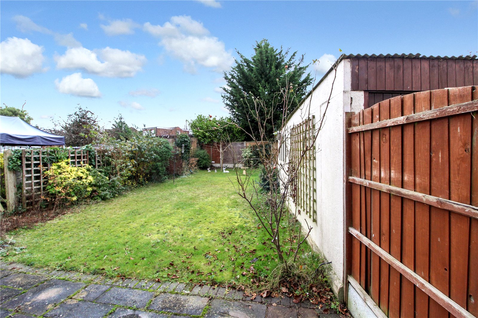 West facing rear garden, mostly laid to lawn with some paved area, access to garage, side access to driveway via gate.