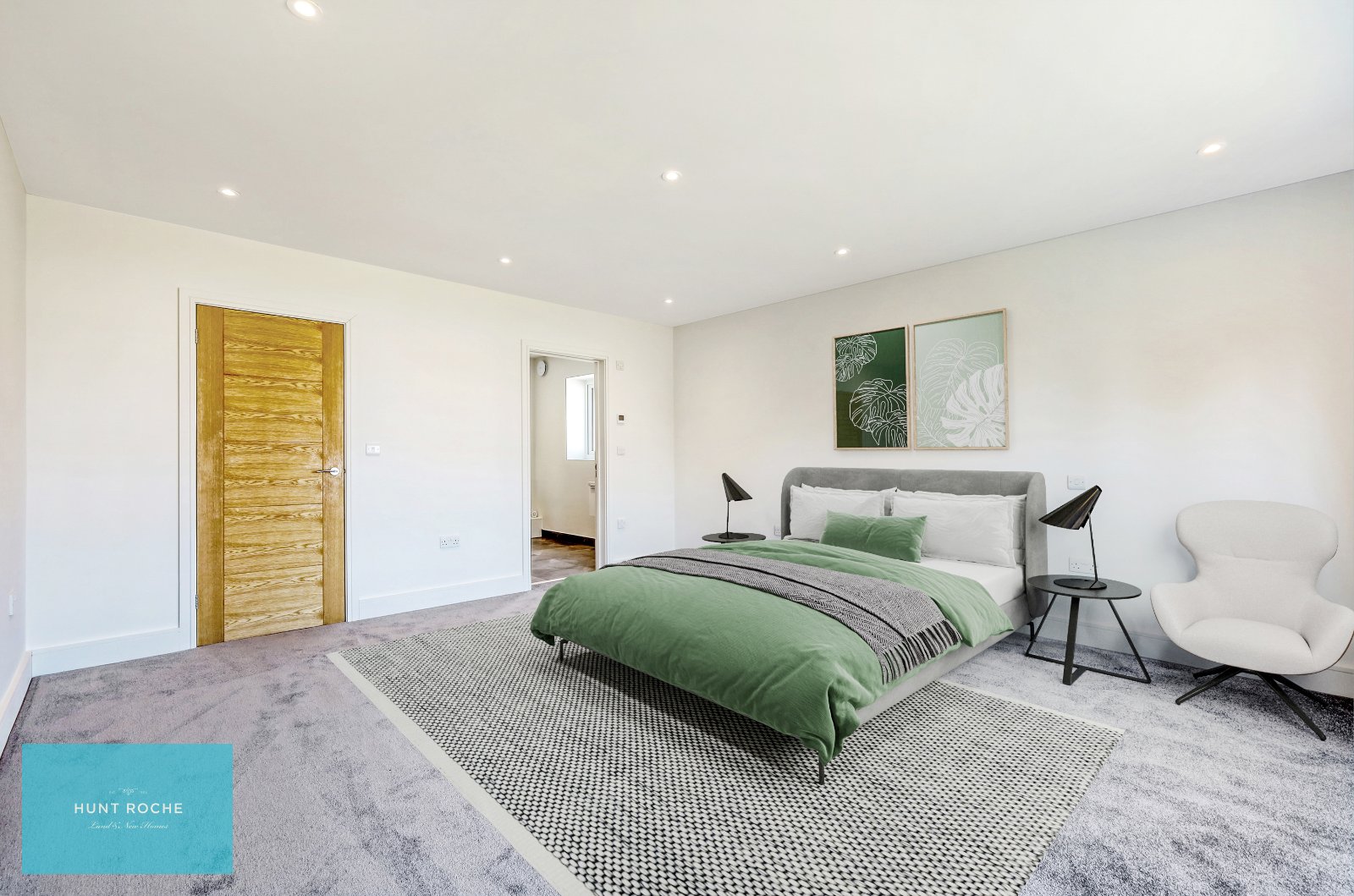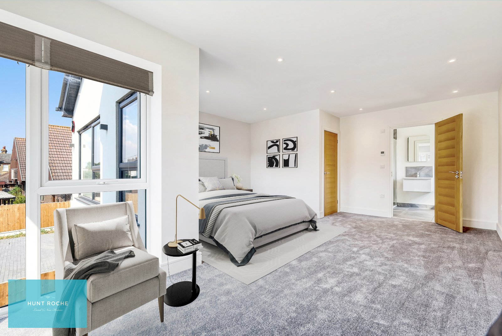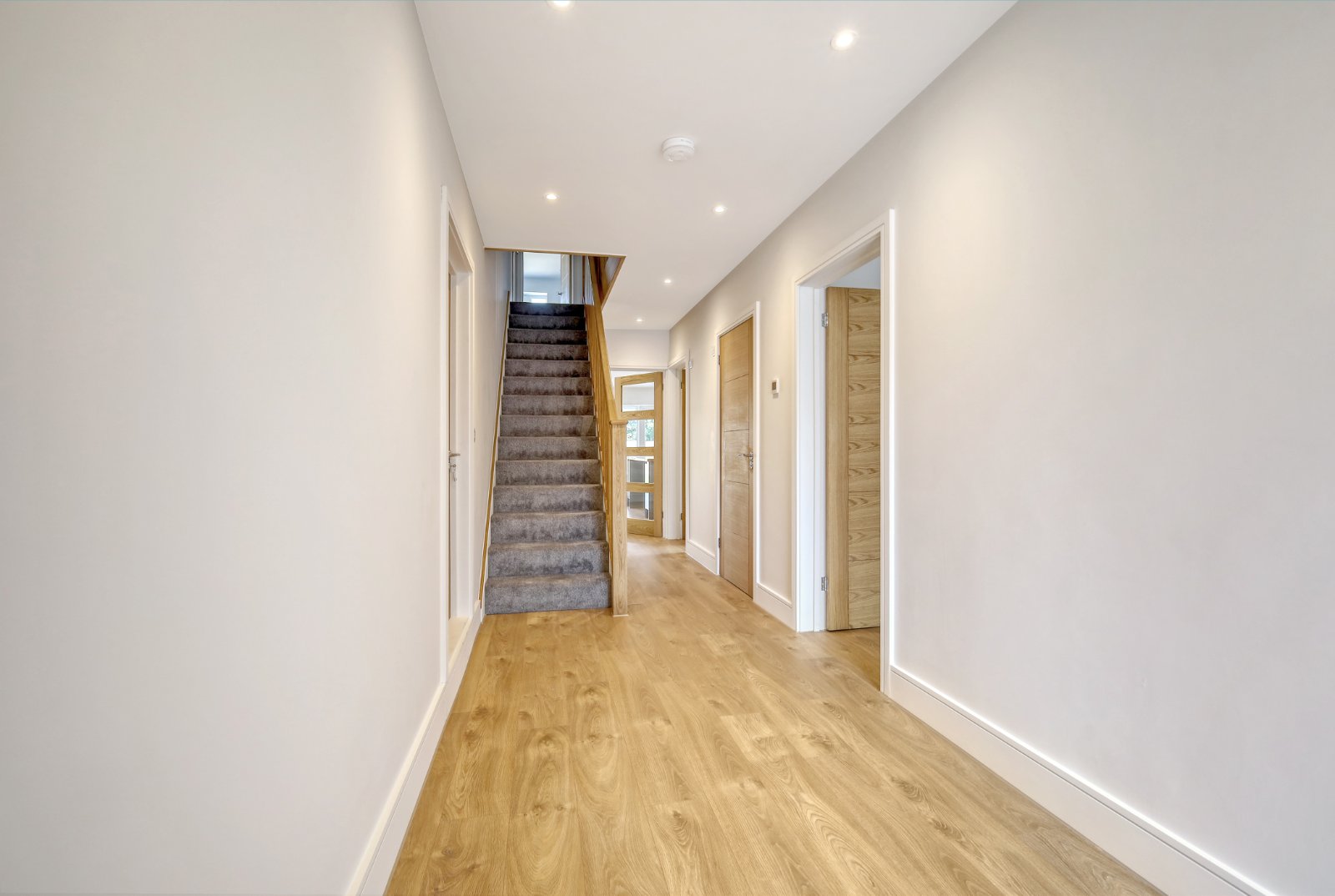 Oak handrail and spindle balustrade. High quality carpet. Traditional style column radiator. Thermostat control panel. Pairs of oak panelled doors to large walk in recessed storage cupboard (measuring 8'5 x 2'5) inset with sensor lighting. Further oak door to further storage cupboard inset with sensor lighting. Smooth plastered ceiling inset with recessed LED lighting with access to loft space. (Agent's Note: The developer has informed Hunt Roche that the loft space offers further potential for extension.)