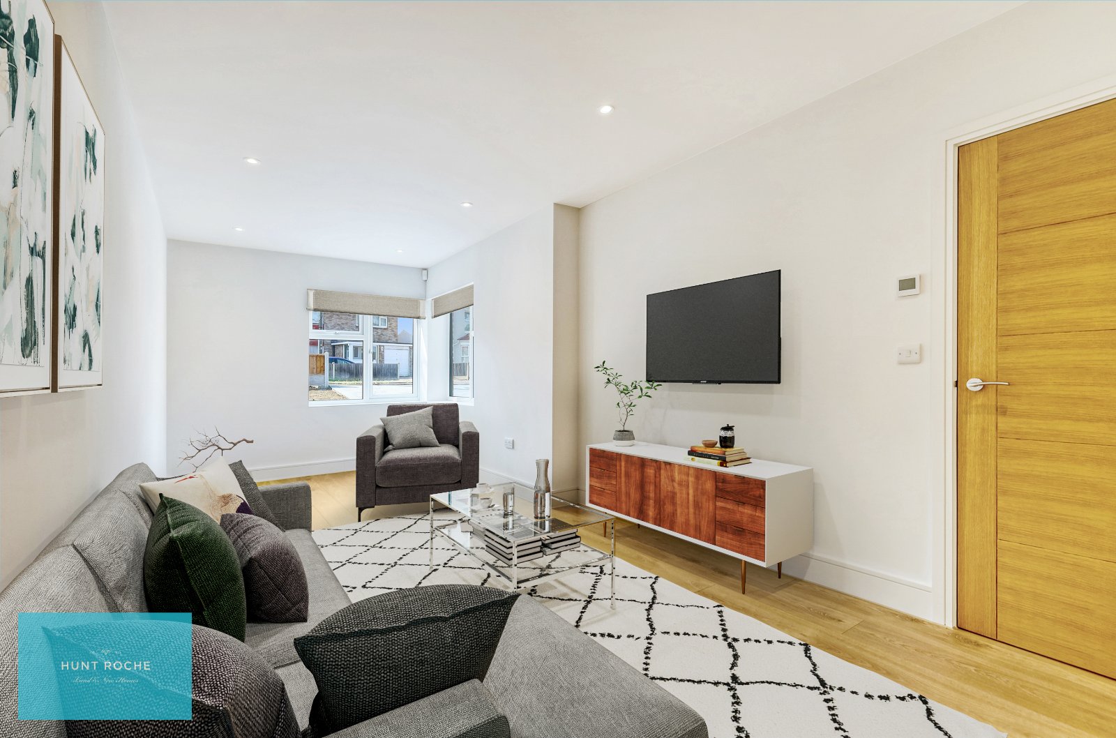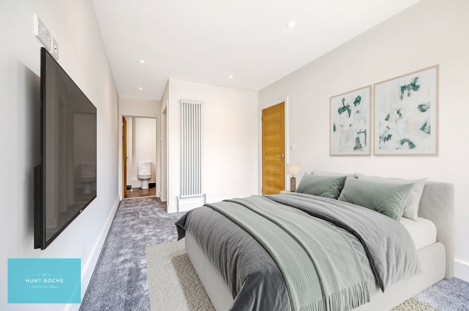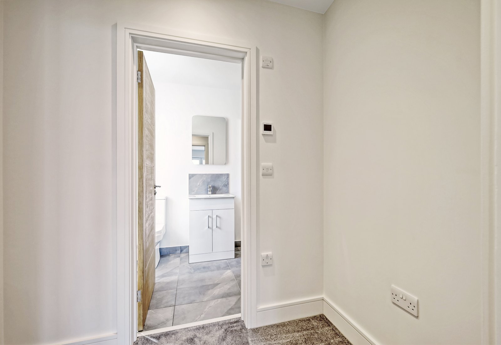 Oak handrail and spindle balustrade. High quality carpet. Traditional style column radiator. Thermostat control panel. Pairs of oak panelled doors to large walk in recessed storage cupboard (measuring 8'5 x 2'5) inset with sensor lighting. Further oak door to further storage cupboard inset with sensor lighting. Smooth plastered ceiling inset with recessed LED lighting with access to loft space. (Agent's Note: The developer has informed Hunt Roche that the loft space offers further potential for extension.)