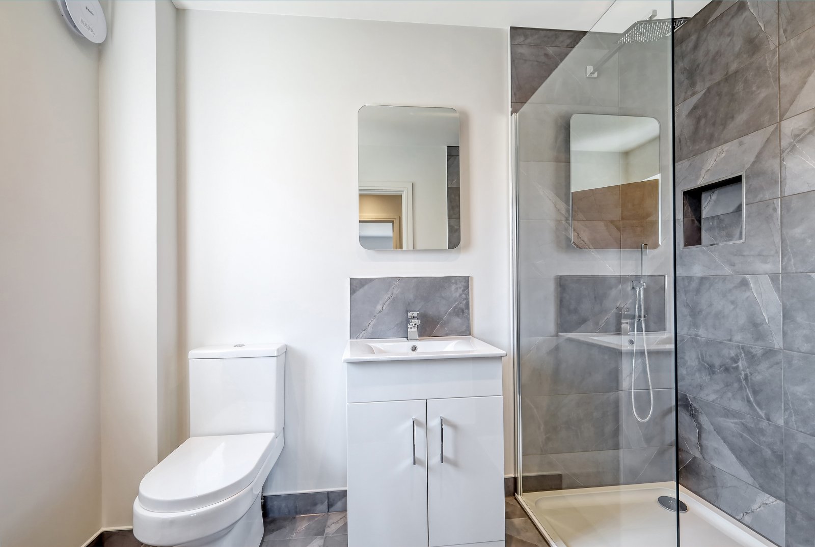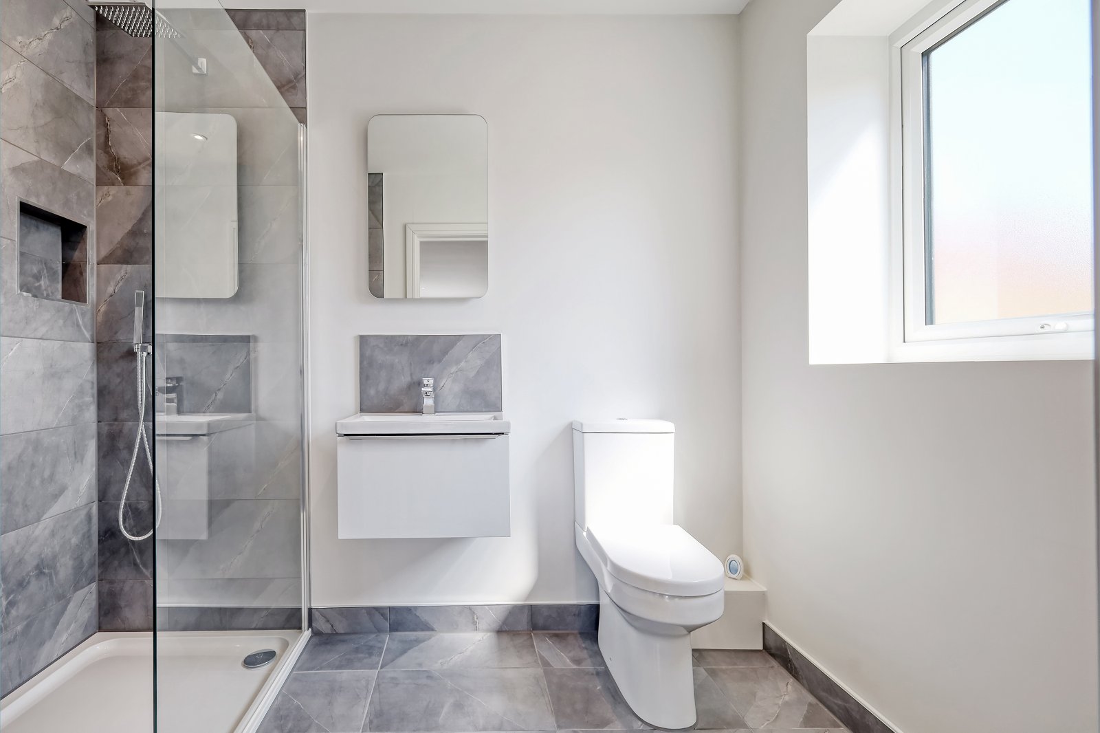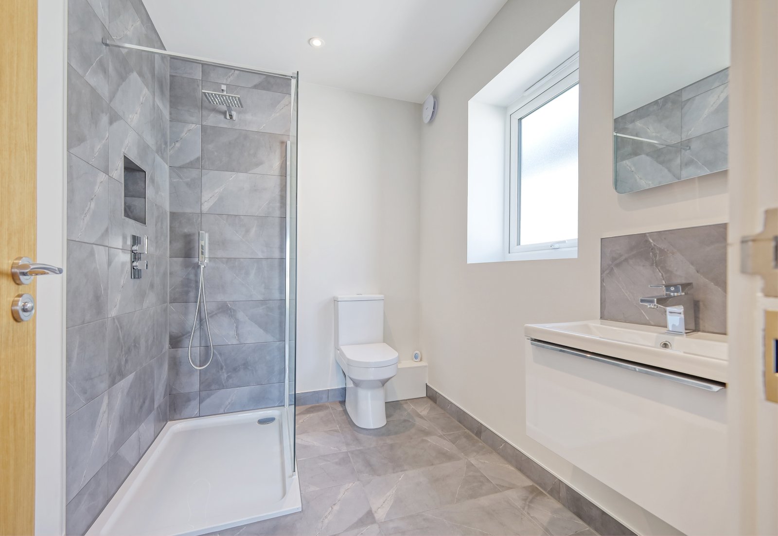 Obscure uPVC double glazed window to side aspect. The modern white three piece suite comprises dual flush wc with soft close seat, suspended vanity wash hand basin with mixer taps and storage drawer under with wall mounted backlit 'LED' mirror. Walk in shower enclosure with fitted screen, wall mounted 'K.Vit' controls with hand held shower and overhead drencher style head. Recessed shelving niche. Partly tiled walls with matching floor tiling with underfloor heating. Chrome ladder style heated towel rail. Smooth plastered ceiling inset with recessed LED lighting.