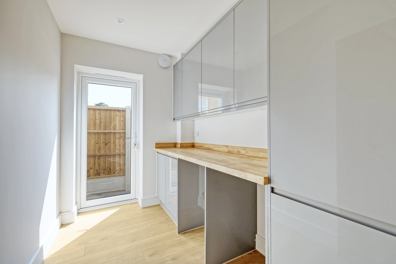Obscure uPVC double glazed door to side providing external sideway access. The Utility Room is fitted with matching units to the Kitchen with a range of modern coloured high gloss cabinetry with feature solid wood worktop over, to one aspect. Under counter recess for washing machine and tumble dryer. Thermostat control panel. High quality laminate wood effect flooring with underfloor heating. Smooth plastered ceiling inset with recessed LED lighting.