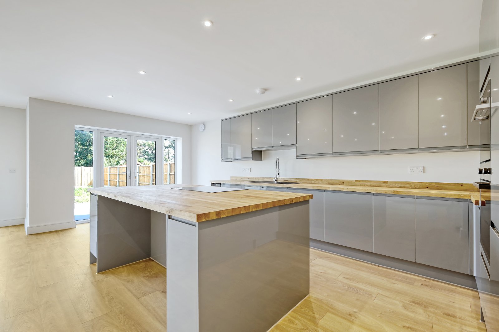 The triple-aspect kitchen/diner/family room is a highlight, offering a fresh and contemporary living space with room for a formal dining table and additional space for living room furniture. The kitchen features a beautiful range of high-gloss cabinetry, wooden worktops, and integrated appliances. Ideal for entertaining or relaxing with family, the room includes bi-fold doors and French doors that open to the rear garden.
