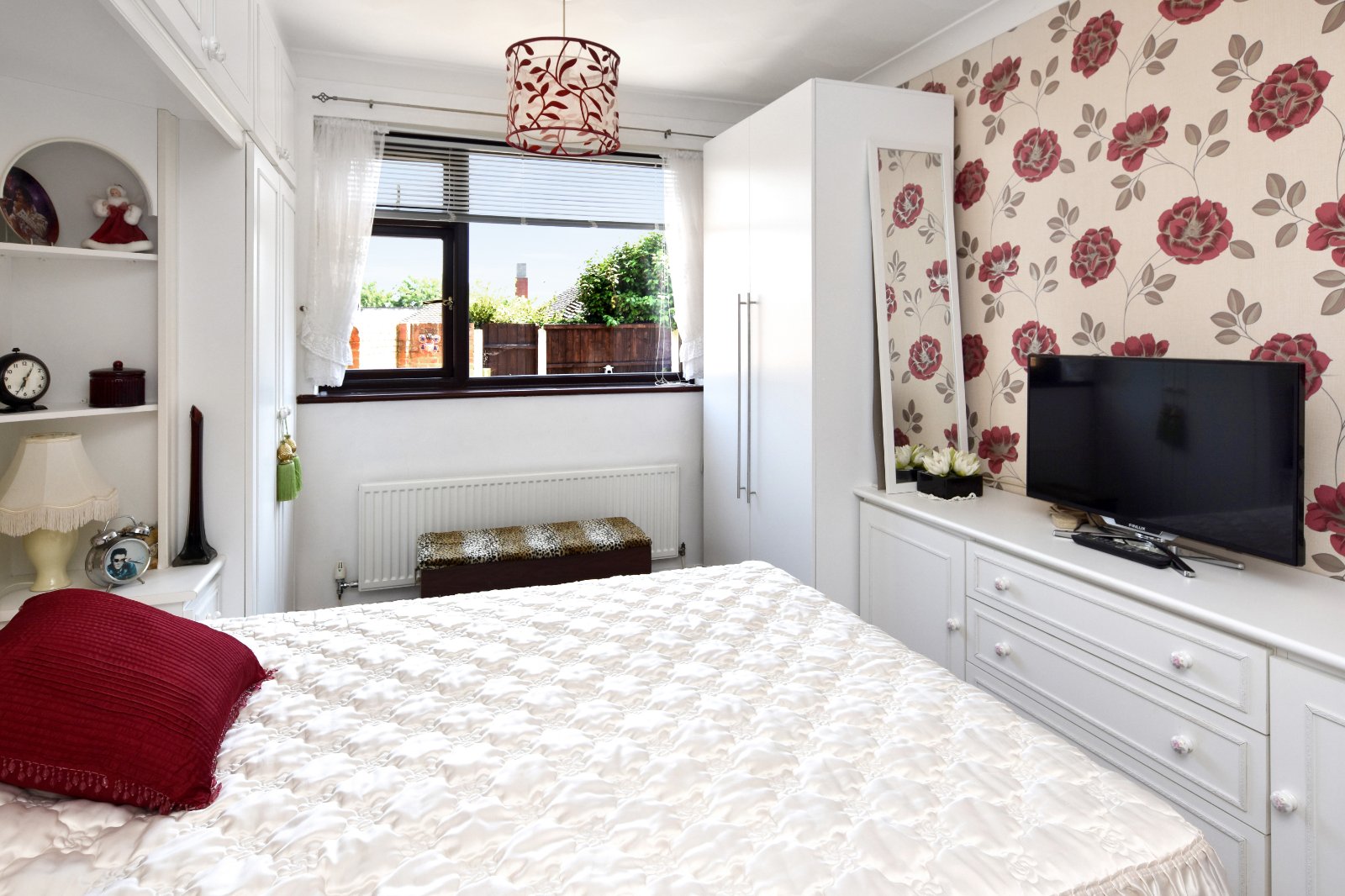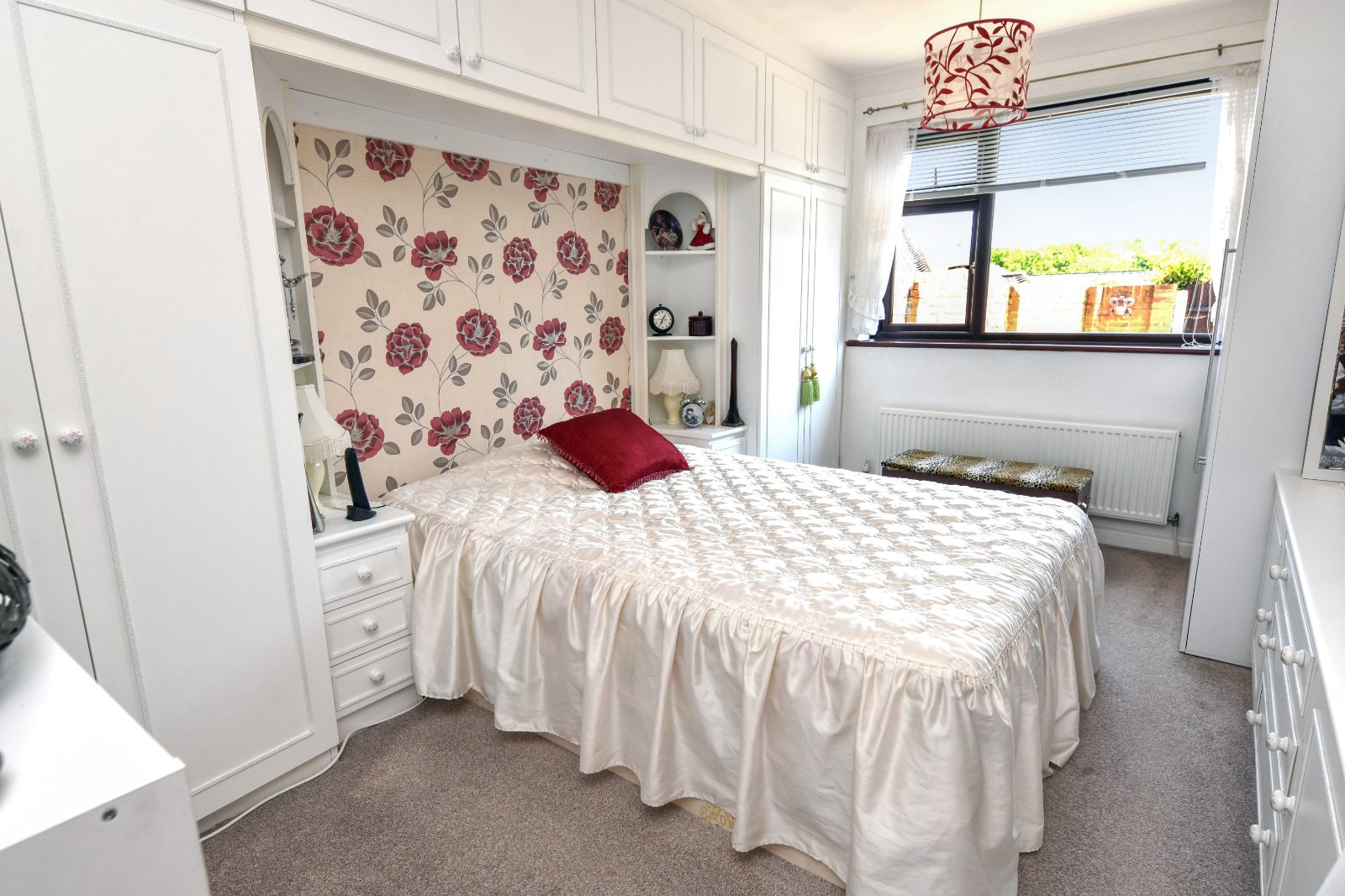 uPVC double glazed window to rear aspect overlooking rear Garden. The Bedroom is fitted with a comprehensive range of matching furniture to include over-bed storage cupboards, various wardrobes and a pair of matching bedside cabinets. Radiator. Coving to textured ceiling.