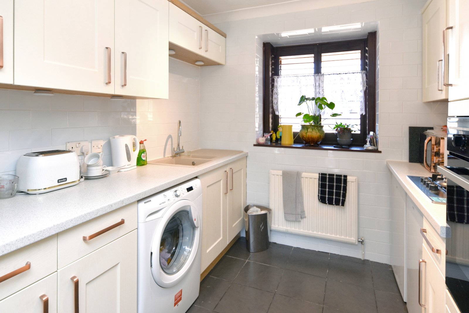 uPVC double glazed square box bay window to front aspect. The Kitchen is fitted with a range of eye and base level units to two aspects with rolled edge working surfaces over inset one-and-a-quarter' single drainer sink unit with mixer tap over. Under counter recess for washing machine. Built-in oven. Four ring gas hob with concealed extractor canopy above. Tiling to all visible walls. Radiator. Coving to textured ceiling.
