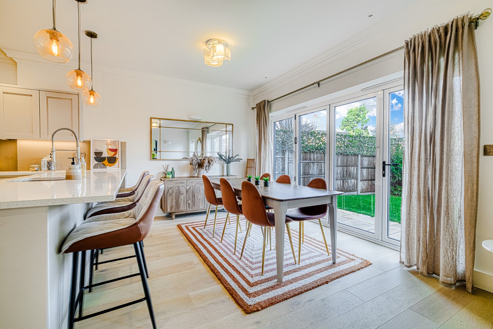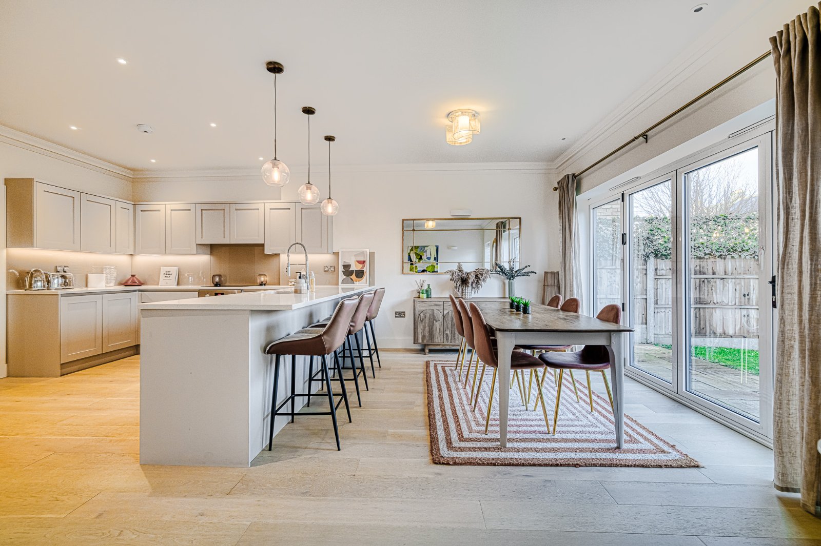 Finished with layered geometric coving to a smooth plastered ceiling, incorporating recessed lighting to the kitchen areas and additional downlighting over the bi-fold doors, together with a central pendant fixtures. This inviting and versatile space is perfectly designed for modern living, family time and social occasions.