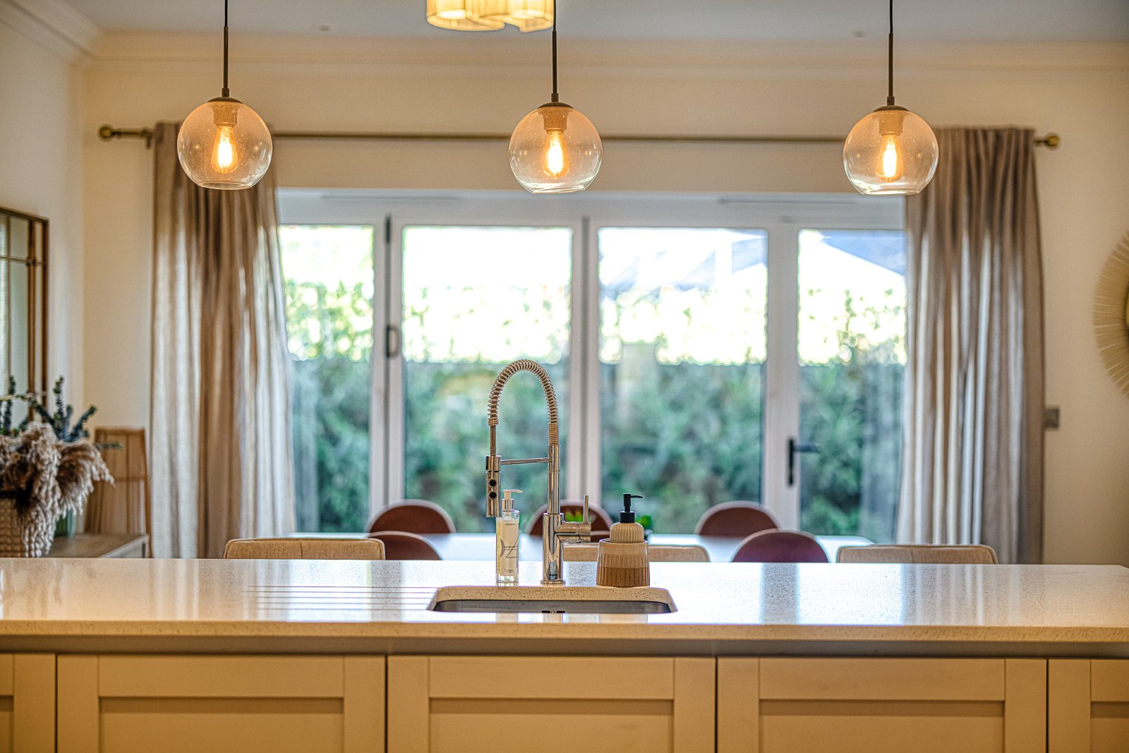 The bespoke, luxury 'Loxley' Kitchen comprises a range of taupe base and wall units with soft-close doors and drawers, complemented by 'Aura Quartz' worktops which extends to provide a breakfast bar seating area of approx. 10ft incorporating a grooved drainer, inset with 'Grohe' stainless steel sink unit and 'Blanco Catris' mixer tap with flexible spout and movable spray. The breakfast bar provides informal seating, with three pendant lights positioned above.