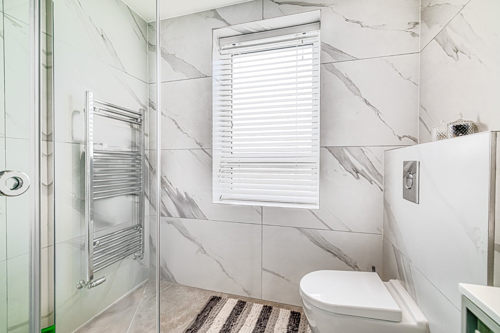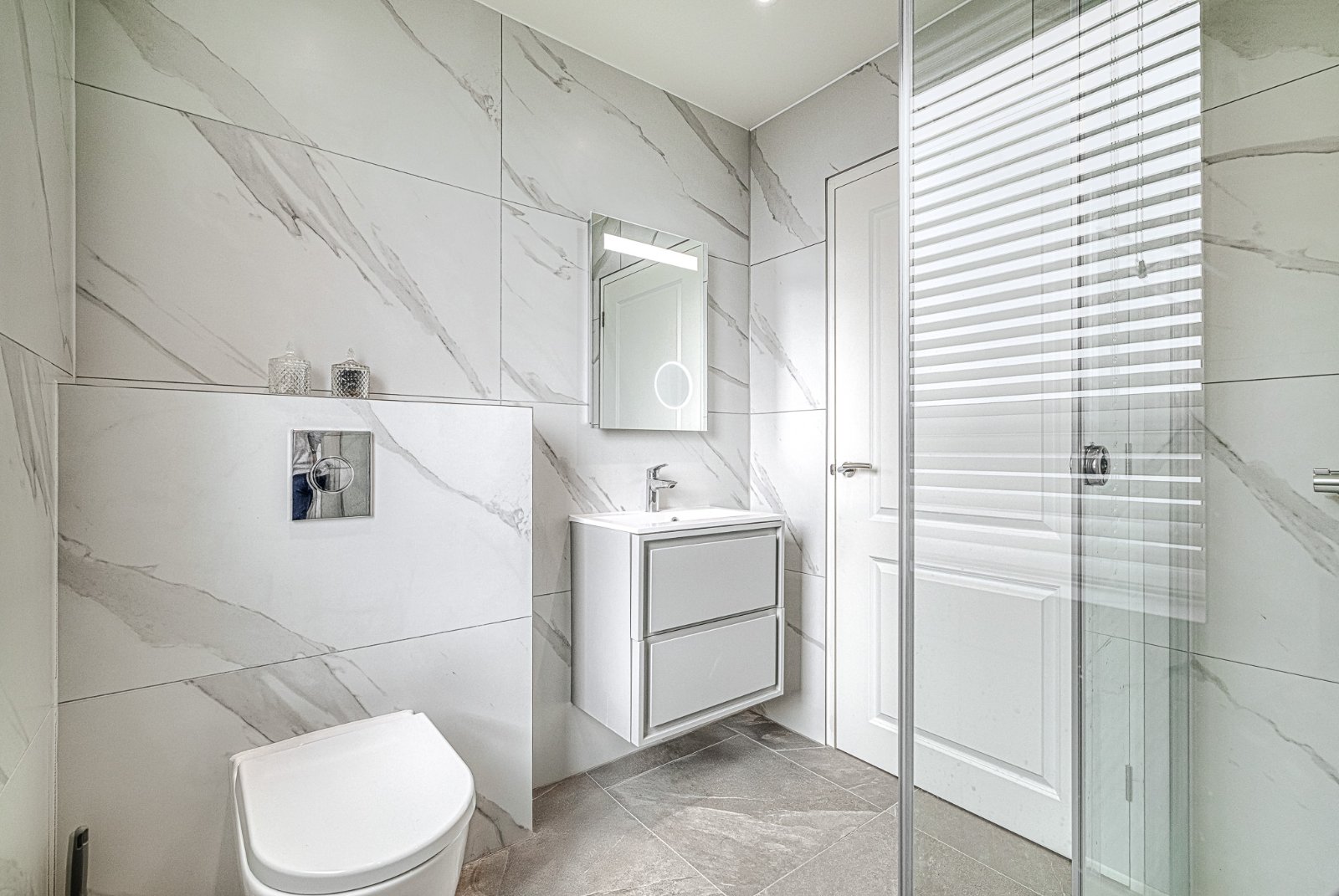 Obscure double glazed window to the front aspect. Luxury white suite comprising a walk-in shower enclosure with integrated shower with handheld and rainfall shower head, vanity wash hand basin with mixer tap over and storage drawers under and concealed cistern low-level dual flush WC. Chrome heated towel rail. Wall-mounted mirror with integrated LED lighting and shaver point to side. The room is finished with full-height porcelain wall tiling in a contemporary marble-effect design, complemented by coordinating floor tiles, creating a sleek and modern finish. Smooth ceiling incorporating recessed lighting and extractor fan.