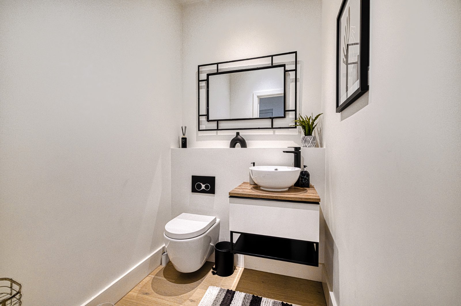 A beautifully presented, contemporary cloakroom featuring a luxury white suite comprising a concealed-cistern WC with 'VitrA' chrome flush plate and a stylish circular porcelain countertop wash hand basin set upon a bespoke vanity unit with warm wood detailing. The unit incorporates a countertop mixer tap, with storage drawer and shelving beneath. The room is finished with brushed limed oak, UV-oiled engineered timber flooring with underfloor heating. A smooth plastered ceiling incorporates recessed lighting and an extractor fan, completing this refined and practical space.