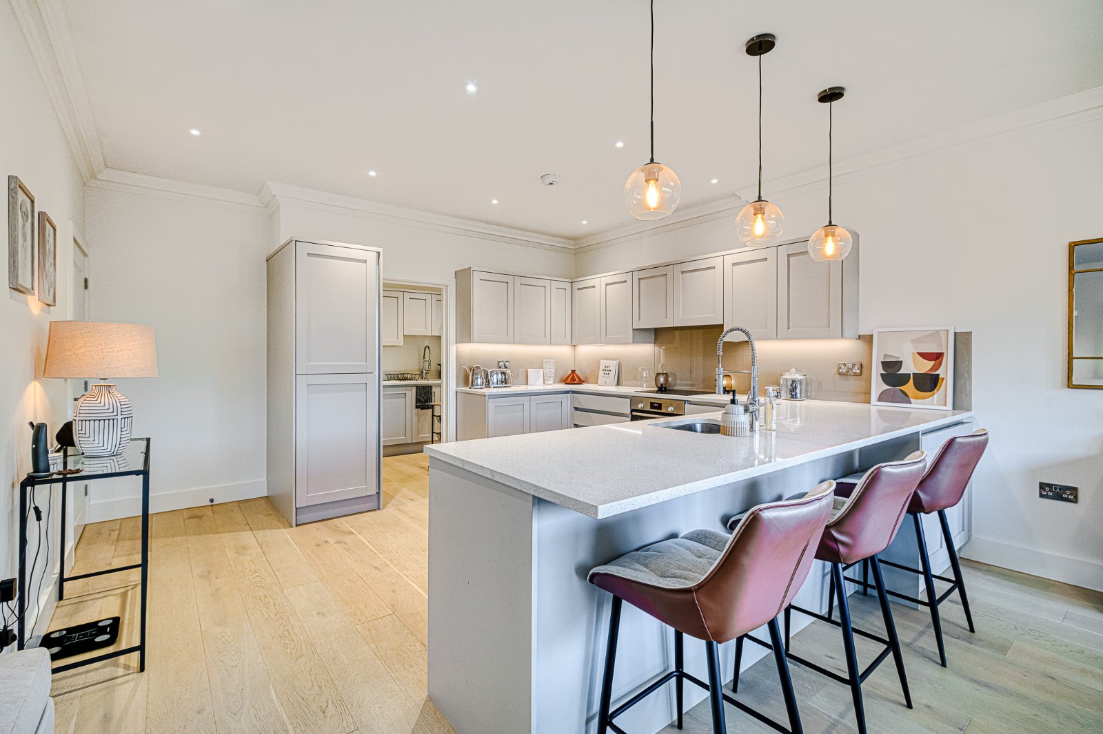 An attractive Sitting Room featuring a square bay window recess inset with a pair of double-glazed windows to the front aspect, affording views towards the Garrison Chapel, and complemented by a further double-glazed window to the side, providing an abundance of natural light. Wall mounted 'Hisense' flatscreen tv (to remain). Brushed limed oak engineered timber flooring with underfloor heating. Wall-mounted light points, underfloor heating control panel and a wall-mounted cable management plate for television. Finished with layered geometric coving to a smooth plastered ceiling, incorporating recessed lighting to each corner of the room and a central pendant fixture.